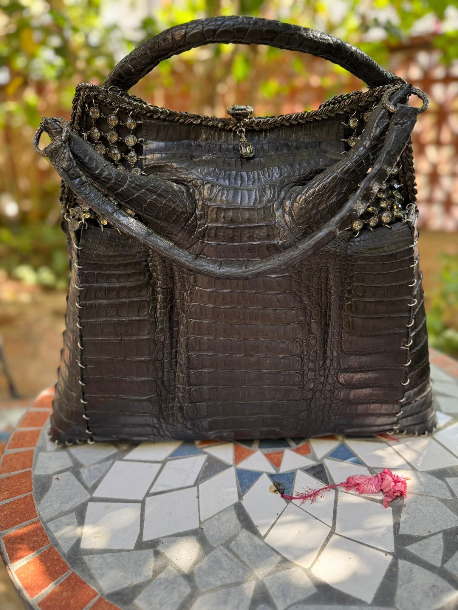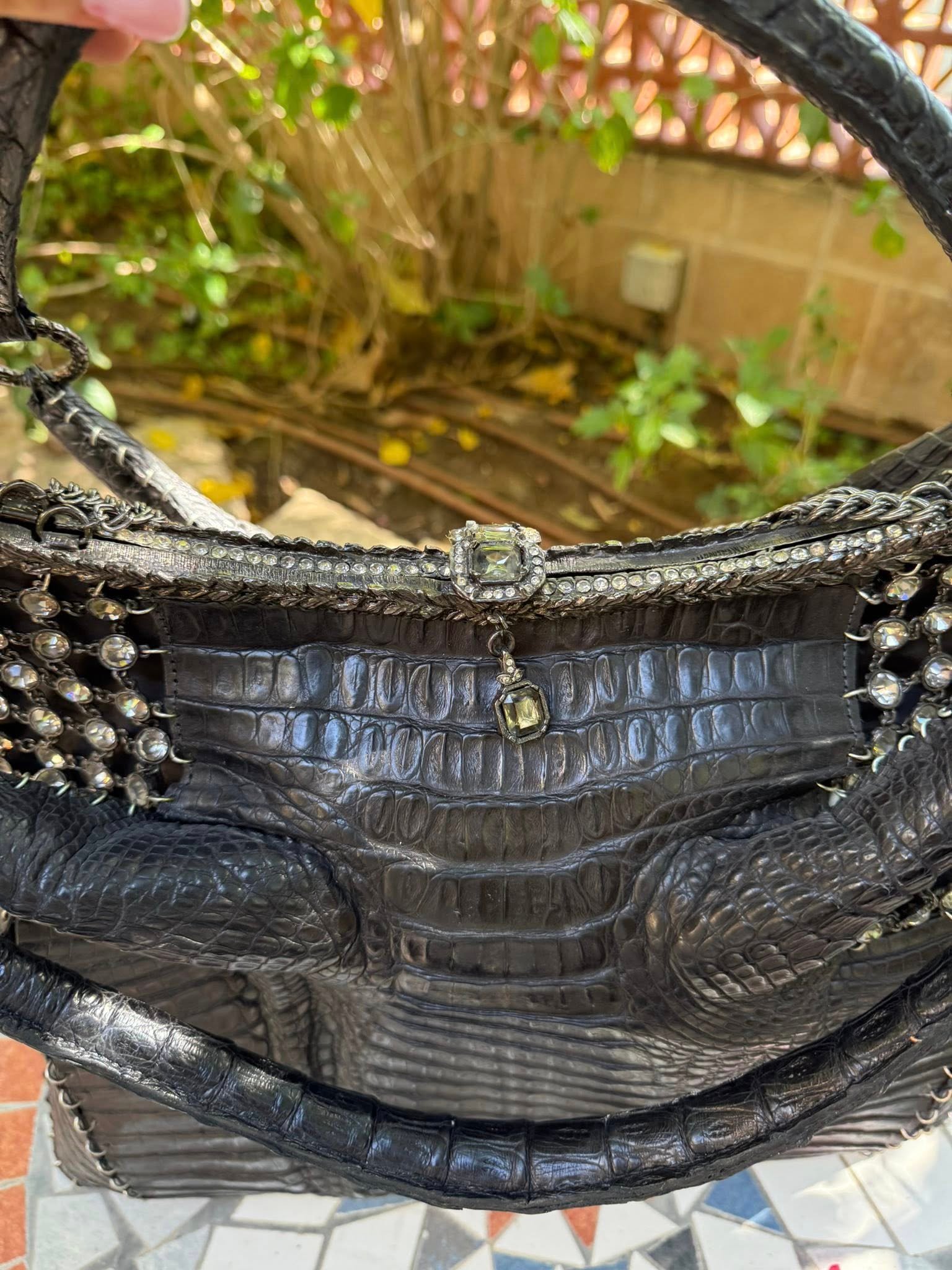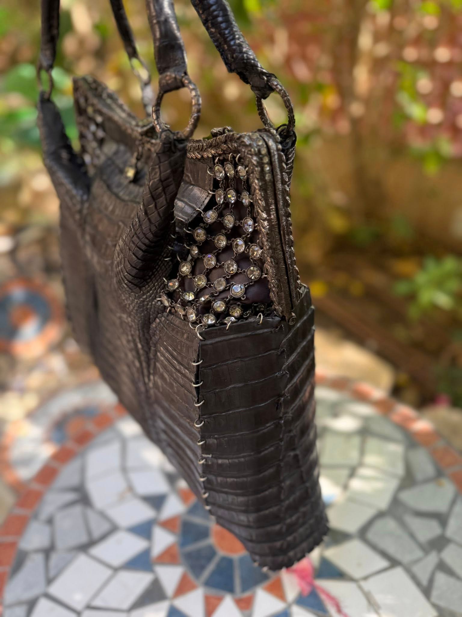 תיק יוקרתי בעבודת יד מעור קרוקודיל אמיתי, עם קישוטי קריסטלים בעיצוב ייחודי. הפרטים המוזהבים, התפרים הבולטים והגימור המדויק יוצרים מראה עוצמתי ונשי. מתאים גם ליום וגם לערב, לפרזנטציה בלתי נשכחת.