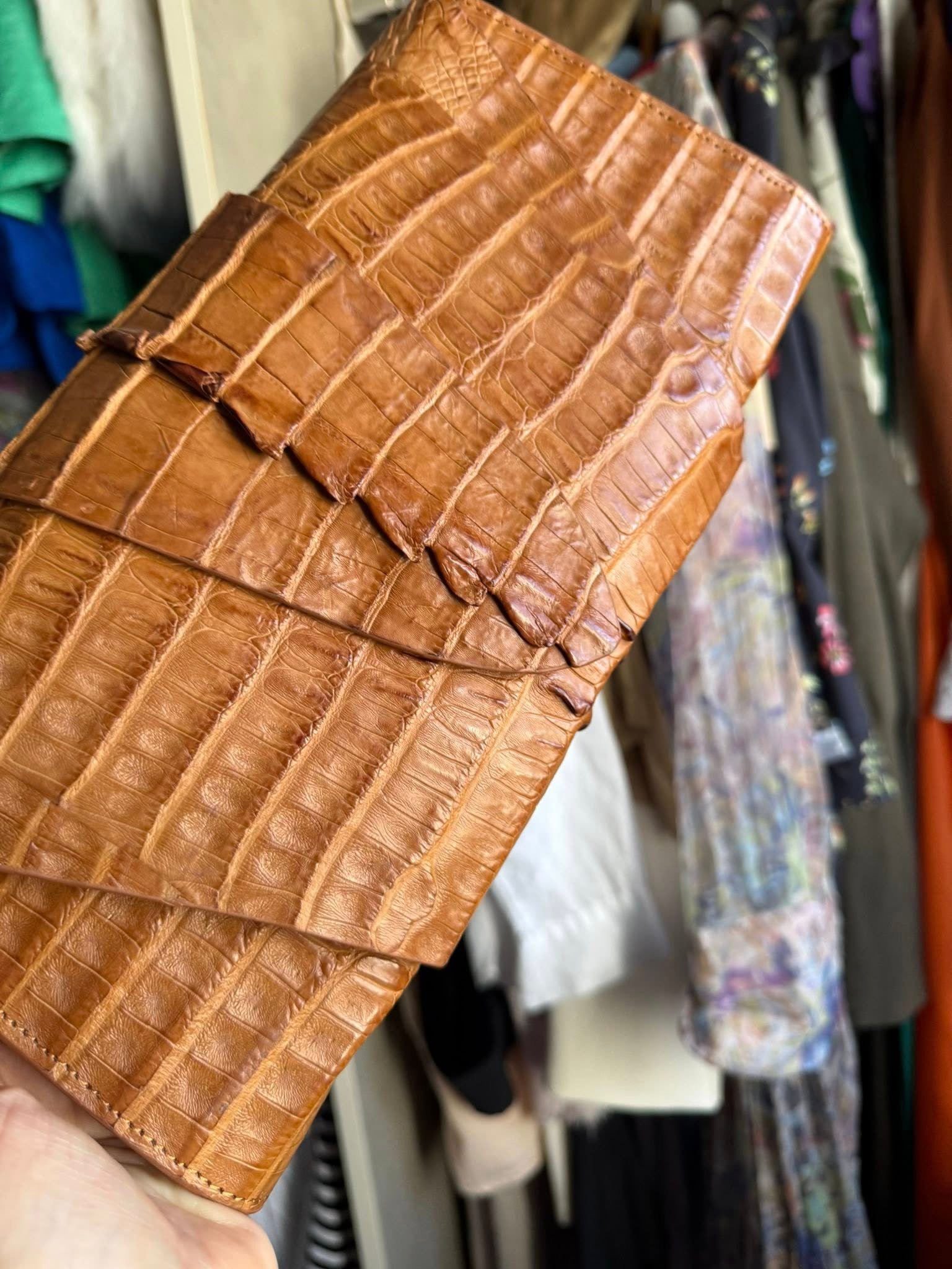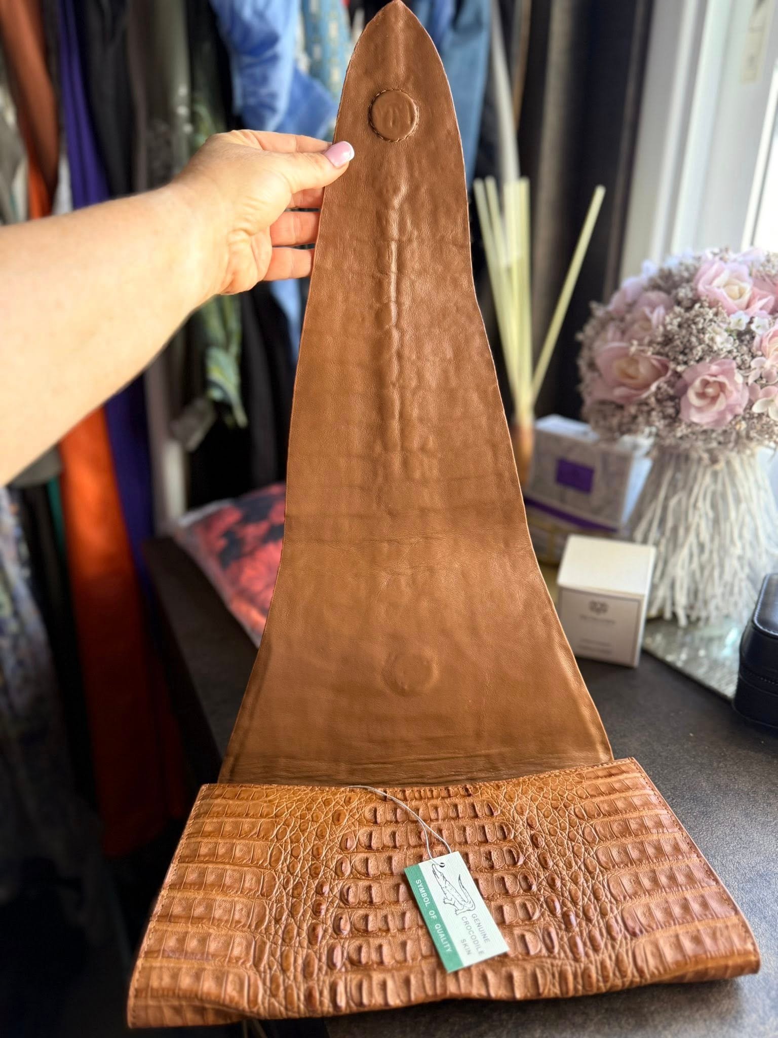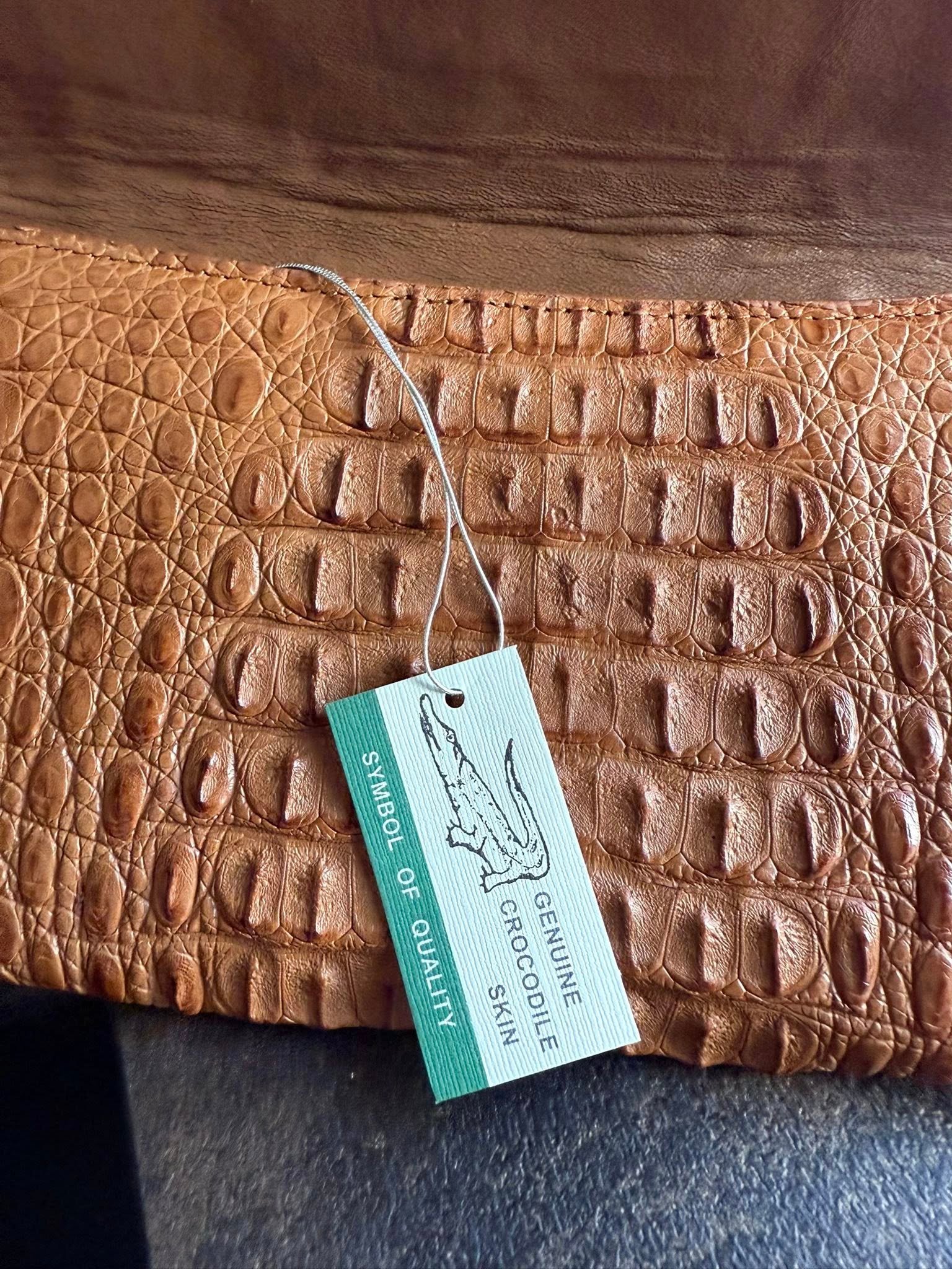 תיק ערב בעבודת יד מעור קרוקודיל אמיתי — פריט ייחודי לחלוטין. עשוי בקפידה, בגוון קרמל חמים עם טקסטורה עשירה ומגע רך. עיצוב קלאסי ונקי שמוסיף לכל הופעה מגע של יוקרה ואצילות.