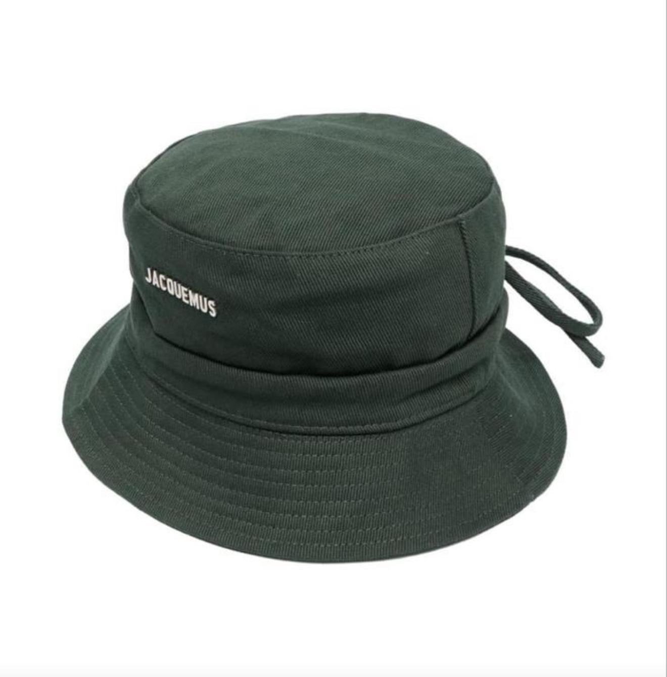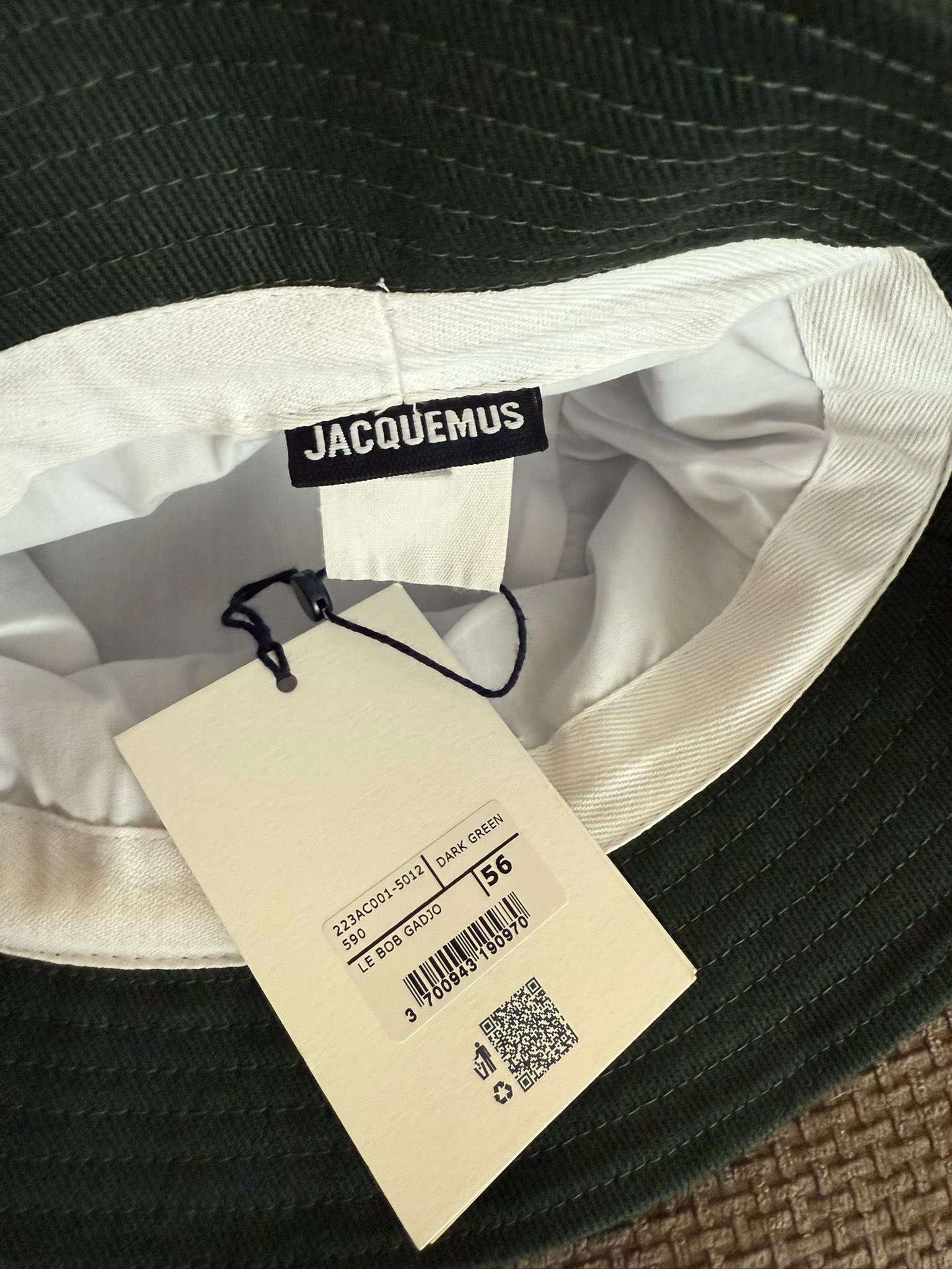כובע באקט מקורי מבית המותג הצרפתי ז׳קמוס בגוון ירוק כהה ועם לוגו רקום. עשוי כותנה איכותית, מתאים למראה אורבני יומיומי או לקיץ יוקרתי על החוף.