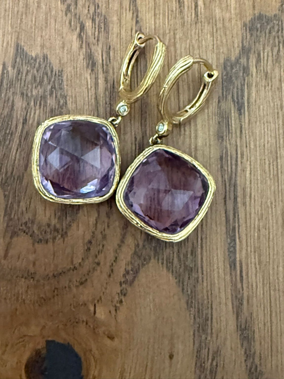 RU: Элегантный комплект Royalty: изящные серьги-кольца с подвесками и мини-подвеска-сердце. Фиолетовые камни в огранке «подушка» красиво ловят свет, золотистая фурнитура добавляет тёплого сияния. Носите вместе для выразительного вечернего образа или по отдельности — как деликатные акценты на каждый день.