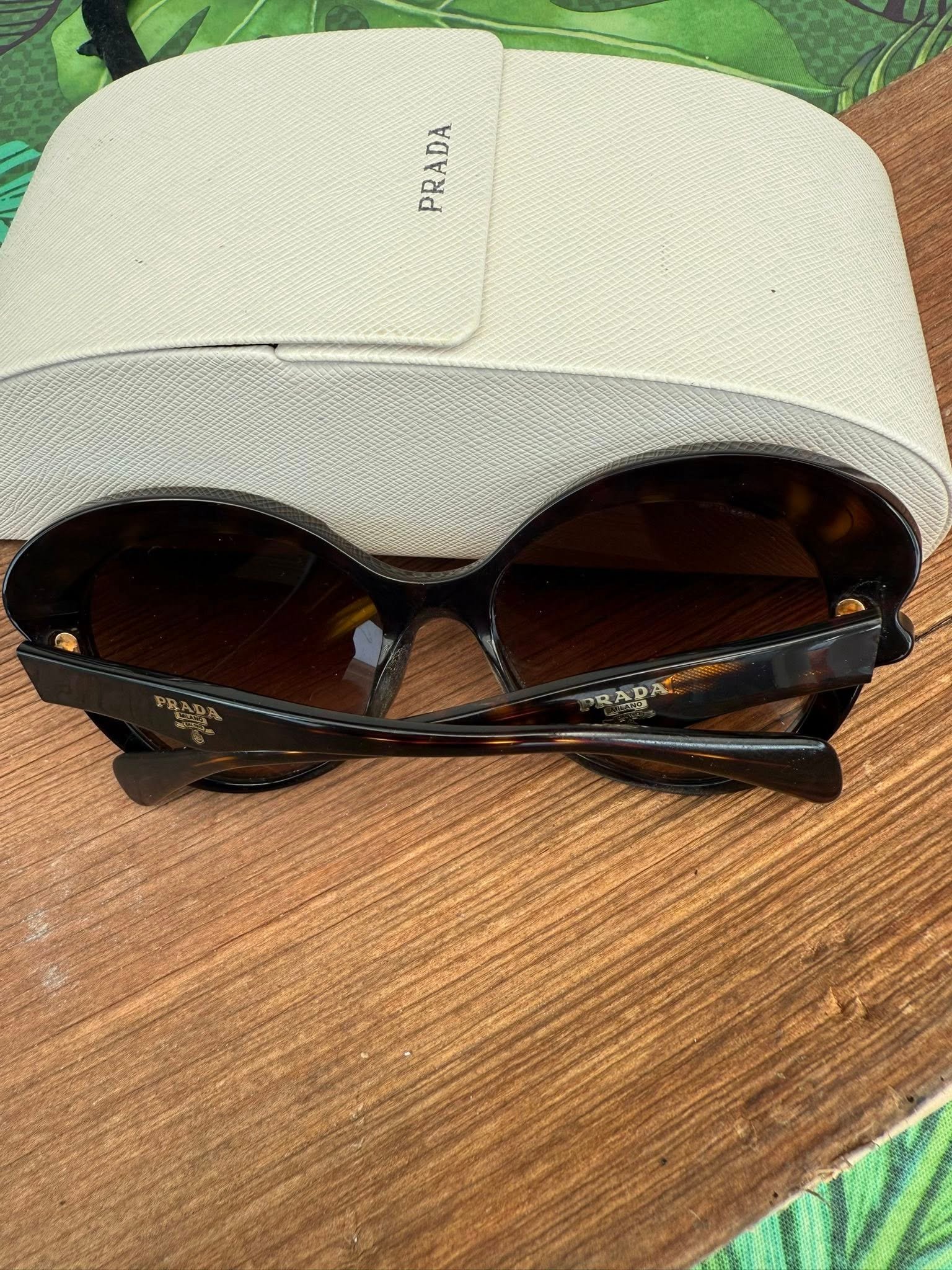 HE: משקפי שמש של Prada עם ידיות מתפתלות בעיצוב אייקוני ומסגרת אליפטית אלגנטית. גימור שחור מבריק ועדשות חומות מדורגות שיוצרות מראה מדויק אך רך. מגיע עם נרתיק מקורי.