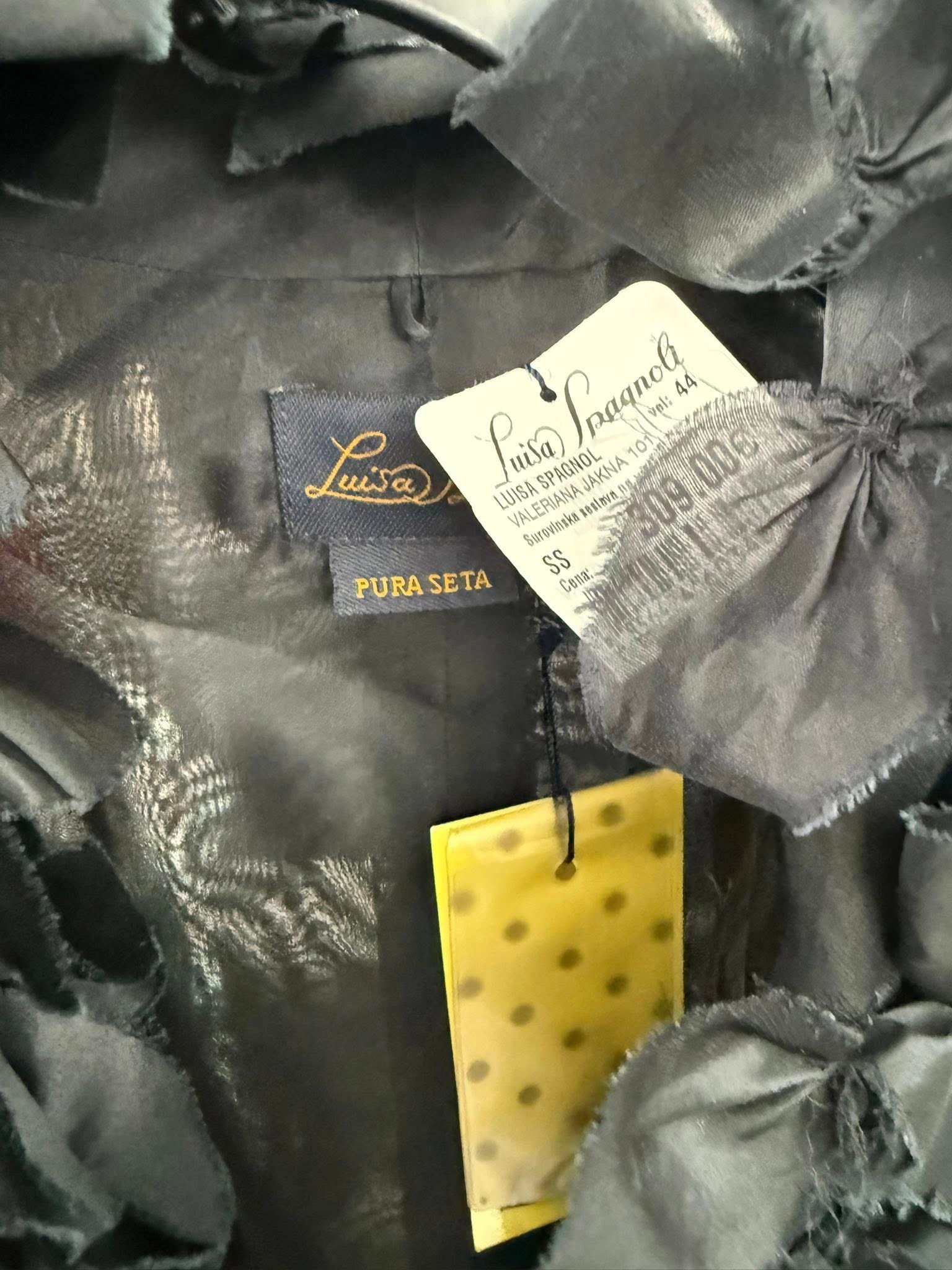 Luisa Spagnoli – חולצת משי יוקרתית בצבע שחור עמוק, עשויה 100% משי טבעי (Pura Seta). הדגש המרכזי הוא קישוט מרשים של עלי כותרת/אפליקציות לאורך החזית ועל השרוולים – מראה קוטור יוקרתי ומחמיא מאוד.