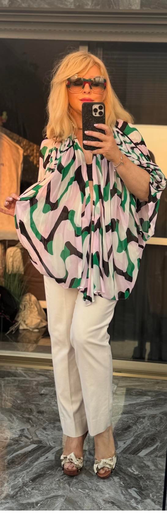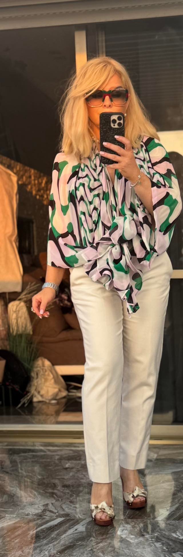 אפשר ללבוש אותה בקשירה קדמית, בקשירת וי, א-סימטרית או משוחררת למראה זורם ועדין. שילוב הצבעים — ורוד, מנטה, לבן ושחור — מחמיא ומודרני, ומתאים למכנסיים לבנים, ג’ינס או חצאית. החולצה חדשה, ללא פגמים.