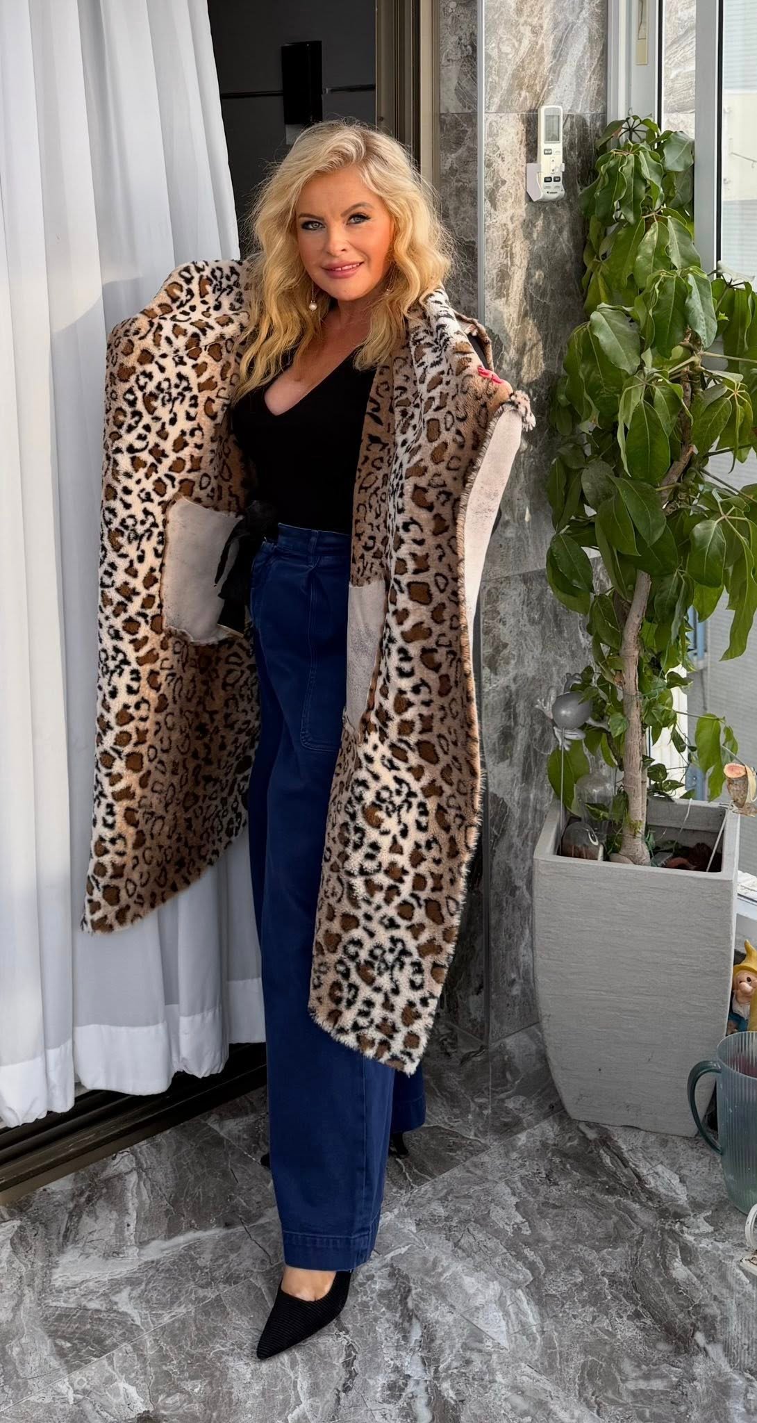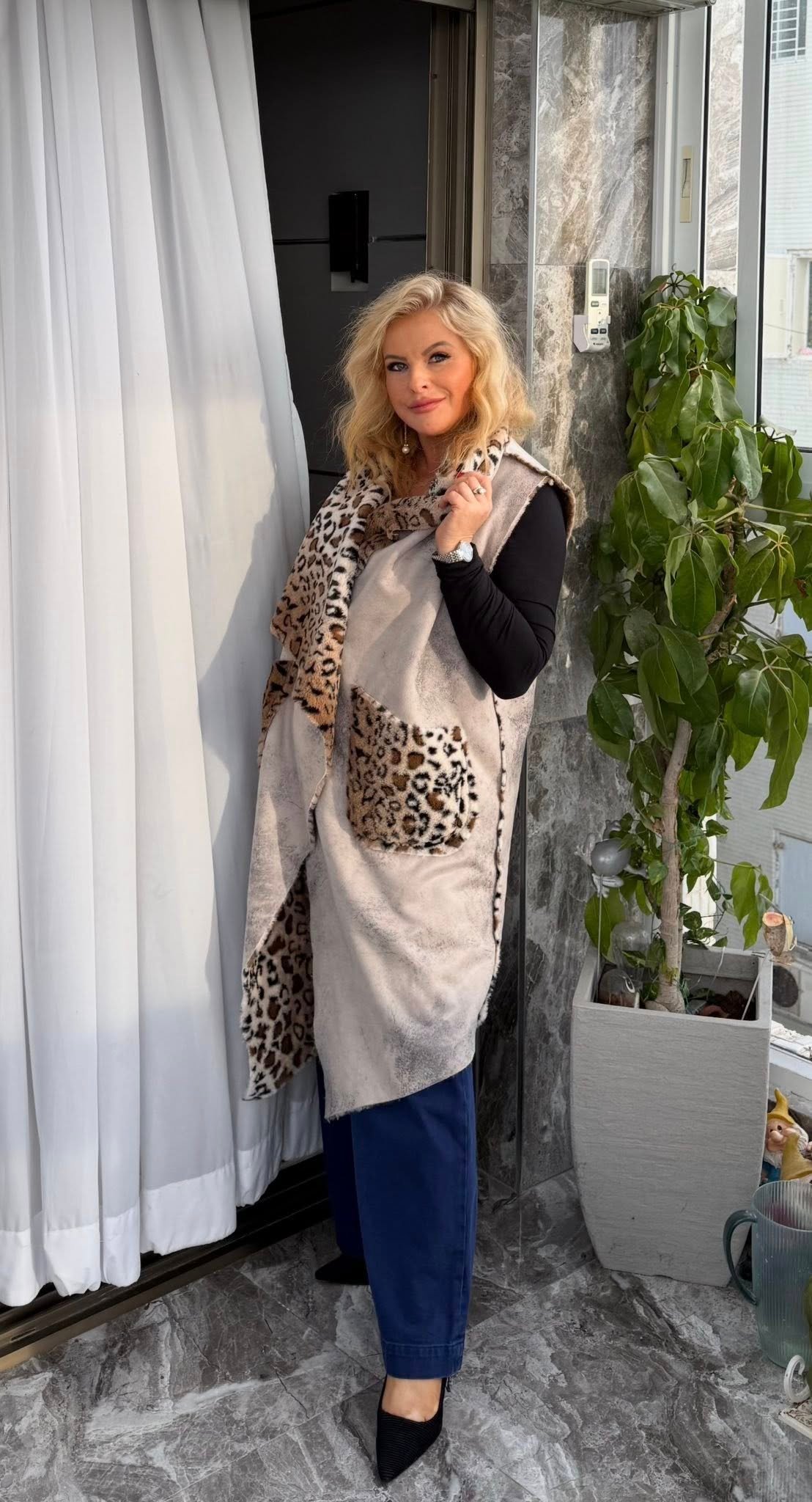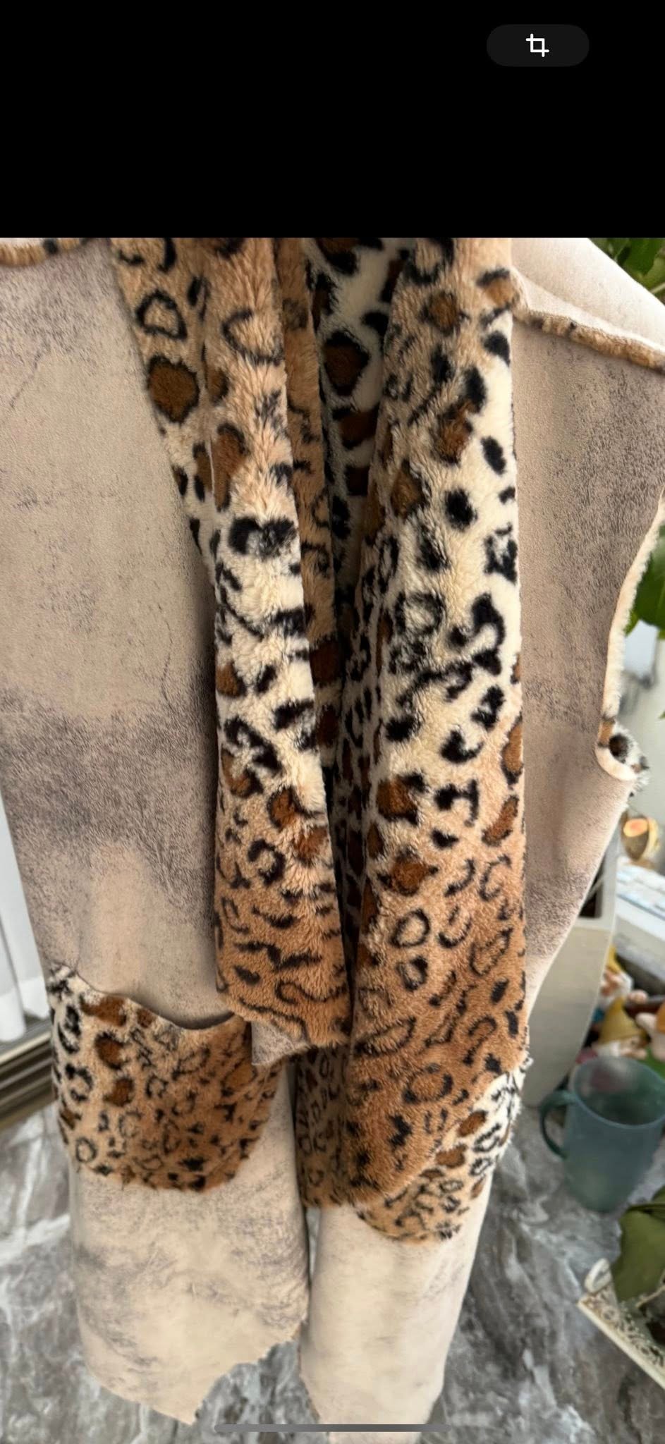 RU: Стильная удлинённая жилетка-накидка с анималистичным принтом 🐆. Мягкий, приятный на ощупь материал, комфортная свободная посадка и выразительный леопардовый рисунок по краю и на карманах. Нейтральная базовая сторона делает вещь универсальной, а леопардовый акцент сразу добавляет образу характер и настроение. Отлично смотрится и с брюками/джинсами, и поверх платьев, создавая эффект «плюс один слой стиля».
