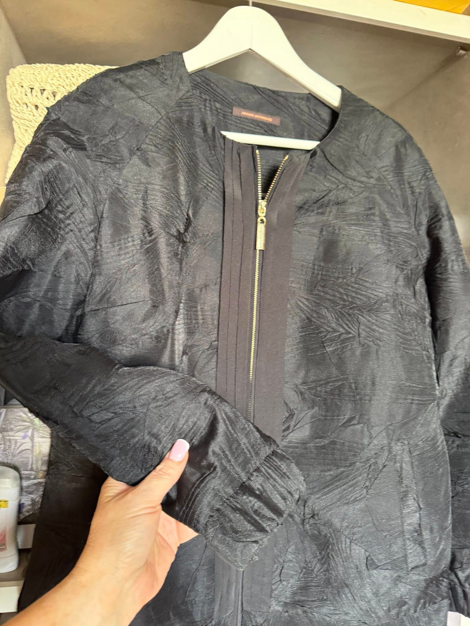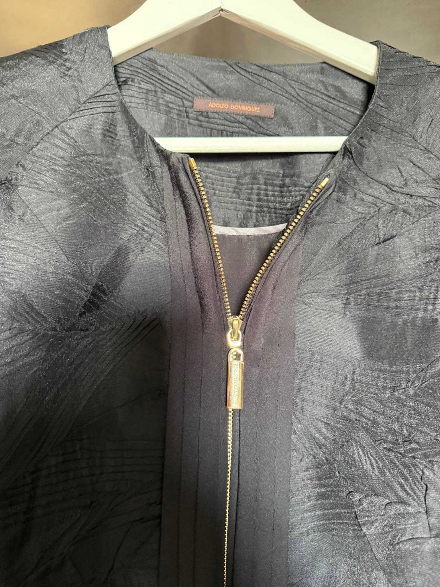 מעיל בומבר מרשים של המותג הספרדי היוקרתי **Adolfo Dominguez**. בד בטקסטורה מיוחדת שיוצר מראה אלגנטי ויוקרתי, עם רוכסן מוזהב שמוסיף טאצ’ מודרני ונקי. נוח, איכותי ומתאים לכל לוק — עבודה, יום-יום או ערב.