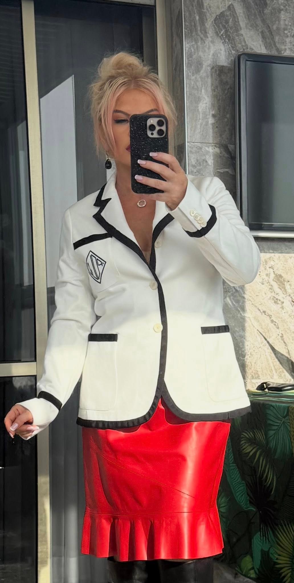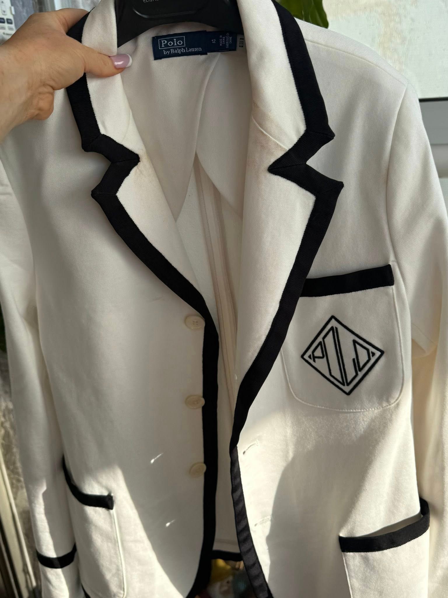 בלייזר לבן עם גימור שחור בעיצוב יוקרתי של ראלף לורן. מתאים לעבודה, לאירועים או למראה יומיומי מתוחכם.