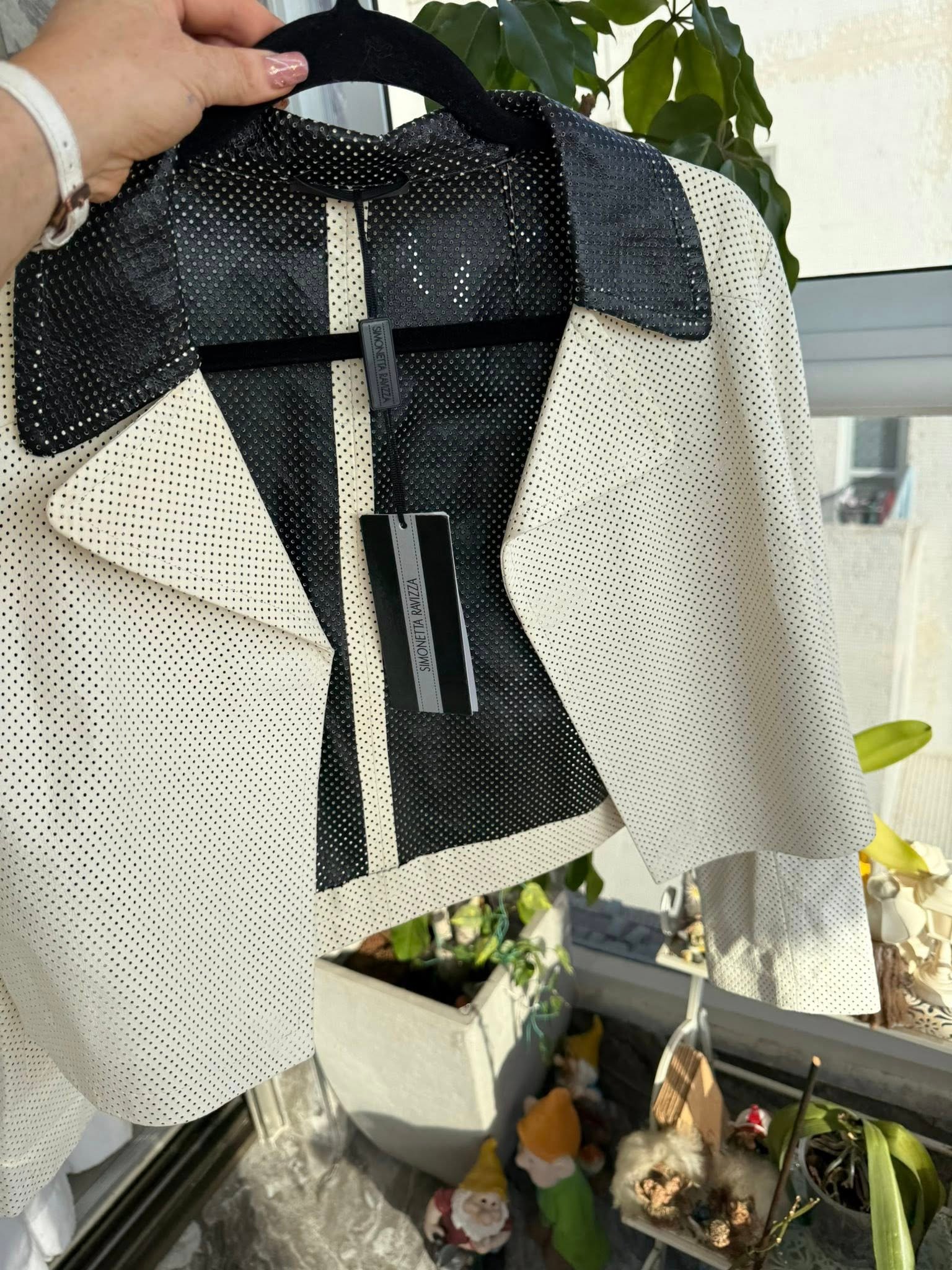 RU: Лёгкий укороченный кожаный жакет с перфорацией — эффектный акцент на тёплый сезон. Контрастный чёрный воротник и чистая линия без застёжки создают современный силуэт. Идеален к платьям, юбкам и высоким брюкам.