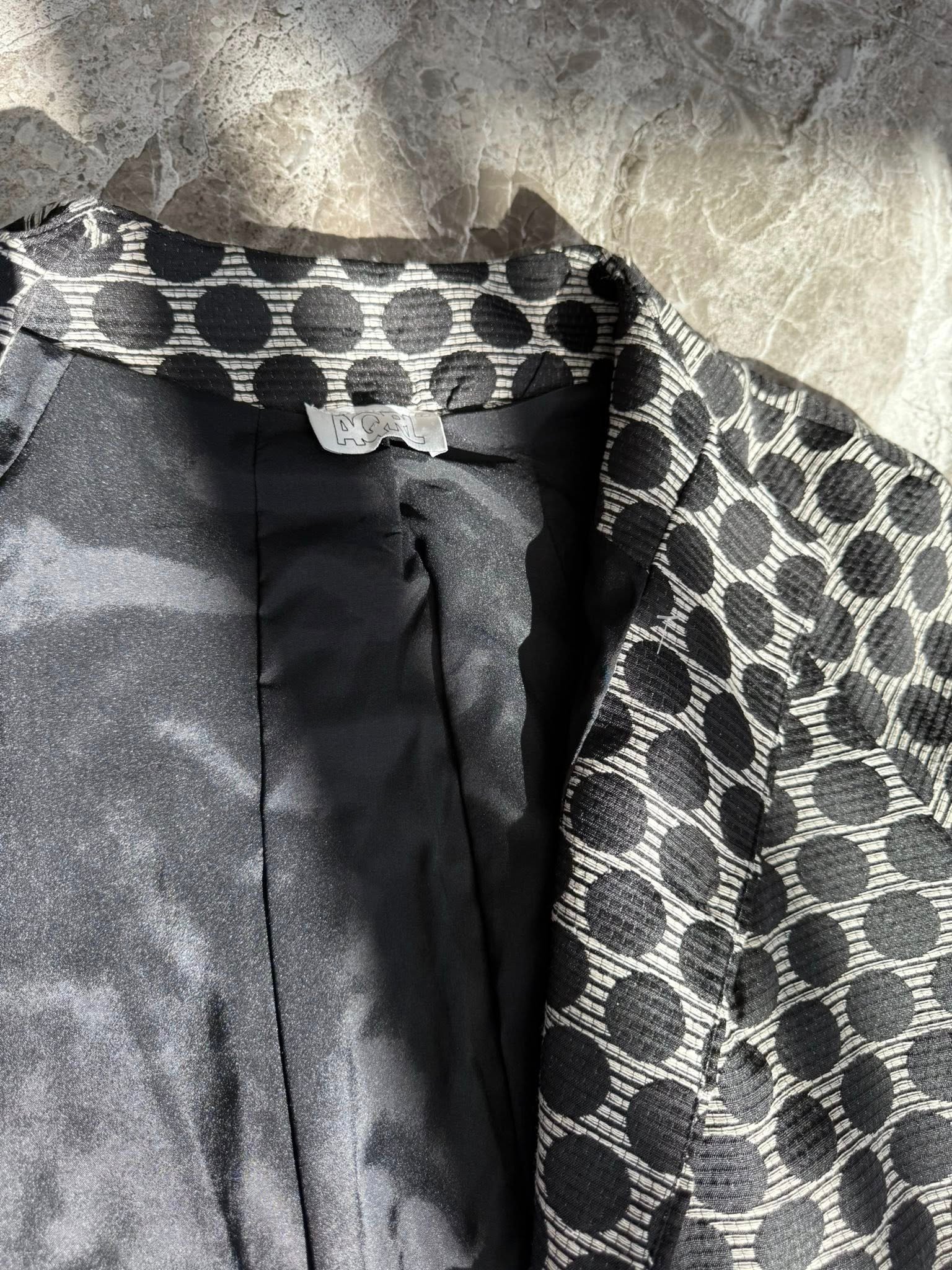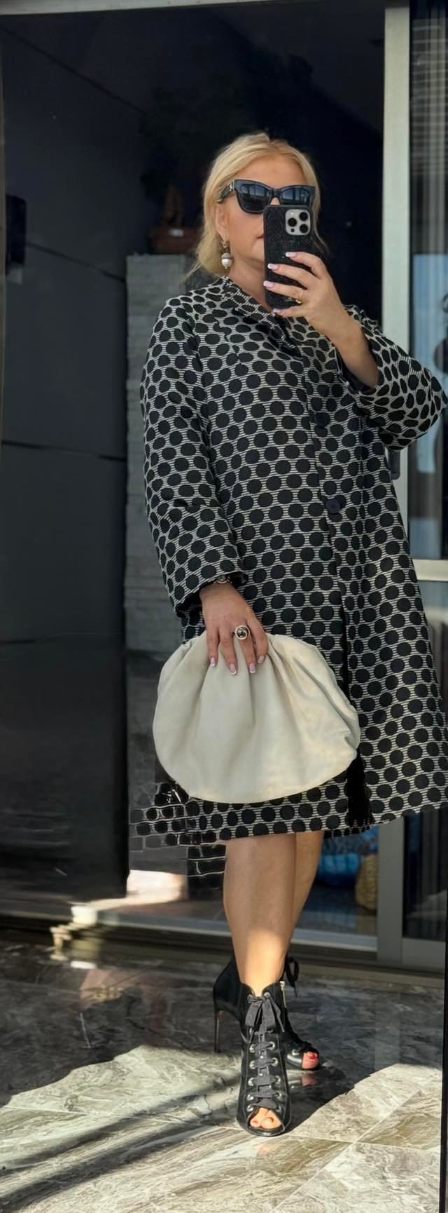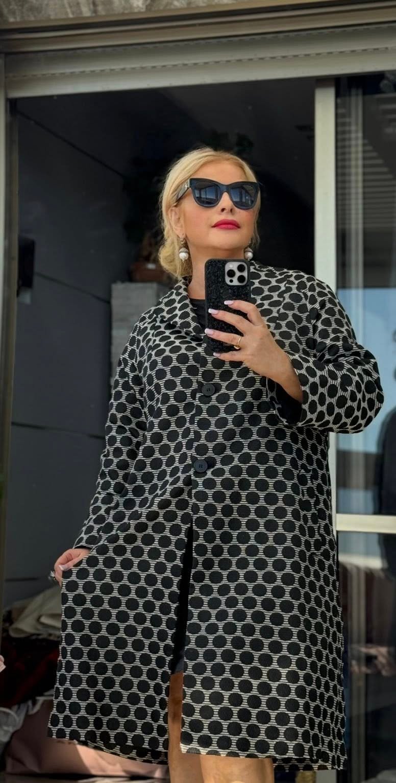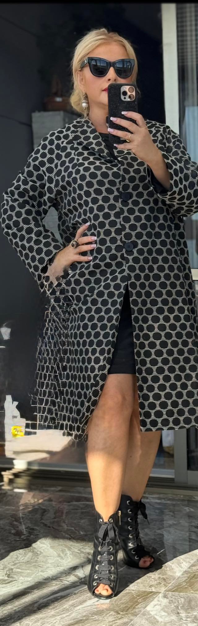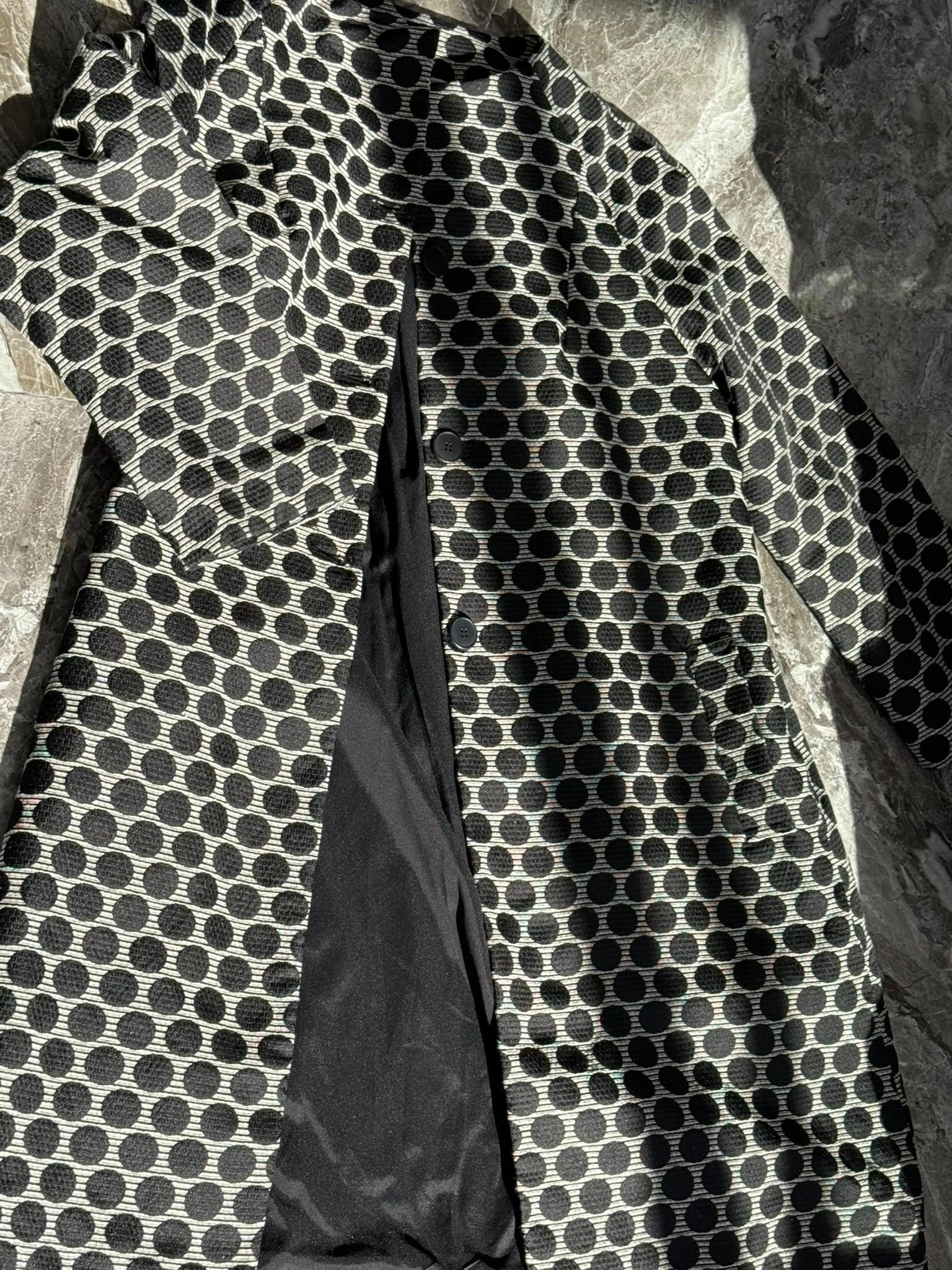 Это тонкое пальто можно носить и как лёгкий жакет — оно идеально подходит для межсезонья и стильных выходов. Мягкий фактурный материал с контрастным чёрно-белым принтом в горошек создаёт утончённый, но выразительный образ. Крупные пуговицы и лаконичный силуэт подчёркивают изящество линии, делая вещь универсальной — для офиса, прогулки или вечернего ужина. Сидит идеально по фигуре, создавая женственный и уверенный силуэт.