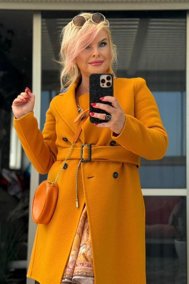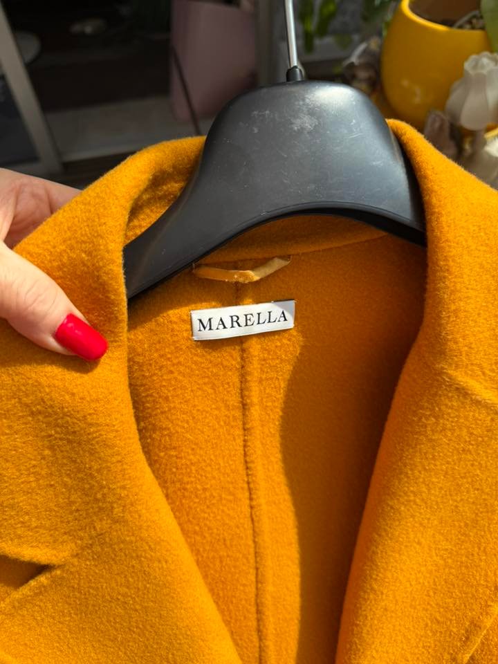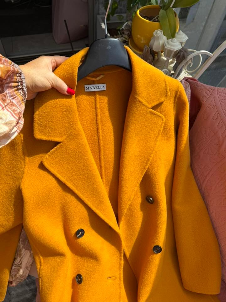 RU: Элегантность и утончённый вкус в одном образе. Пальто Marella в тёплом жёлтом оттенке подчёркивает индивидуальность, а идеальный крой и безупречное качество создают гармонию стиля и комфорта. Универсально сочетается с платьями и джинсами — от дневных выходов до вечерних встреч.