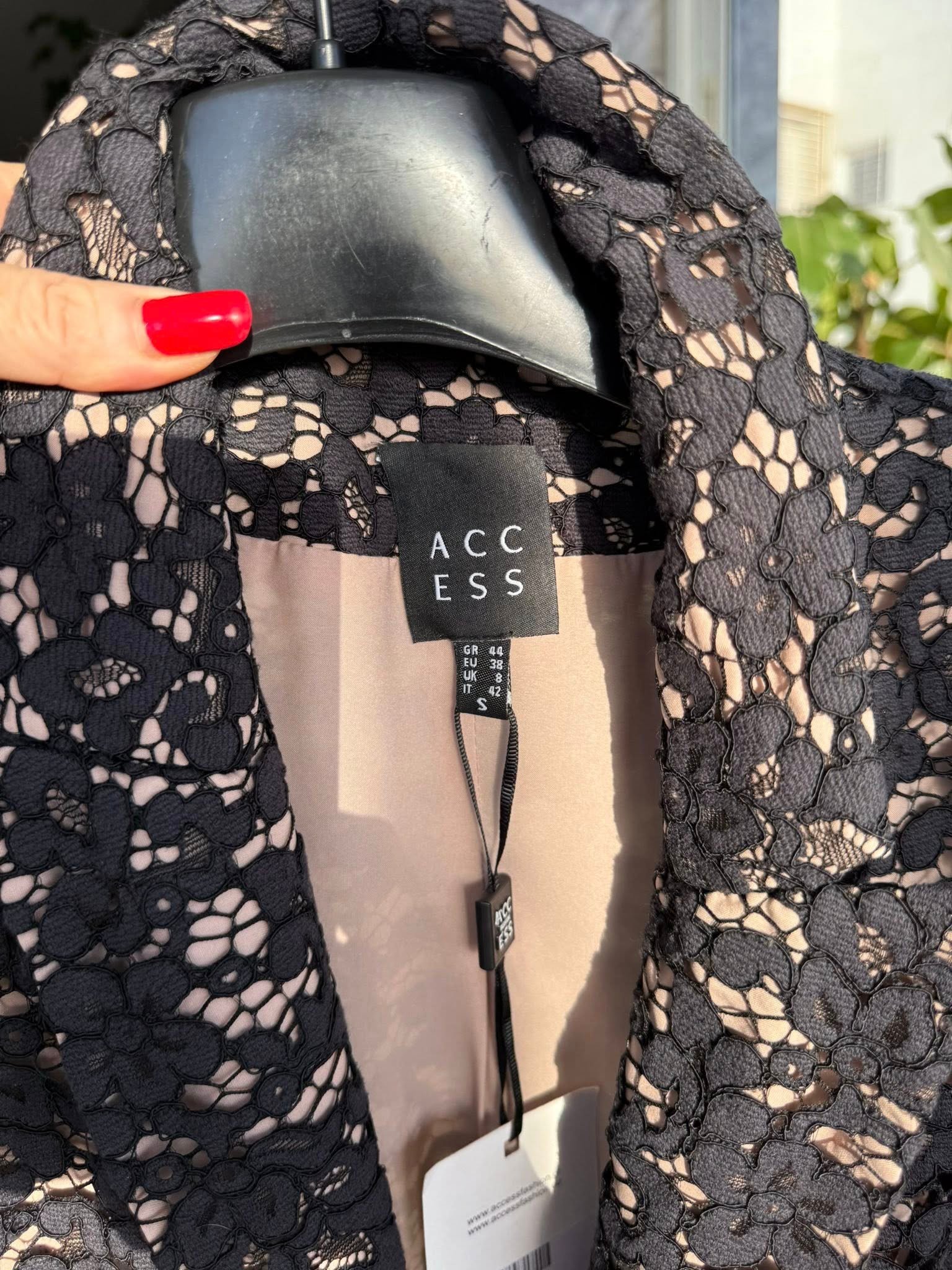 ז’קט תחרה שחור מבית ACCESS עם בטנה בגוון גוף. גזרה מחמיאה שמתאימה לשילוב עם לוקים קלאסיים, ערביים או יומיומיים. פריט מלא שיק ונשיות.