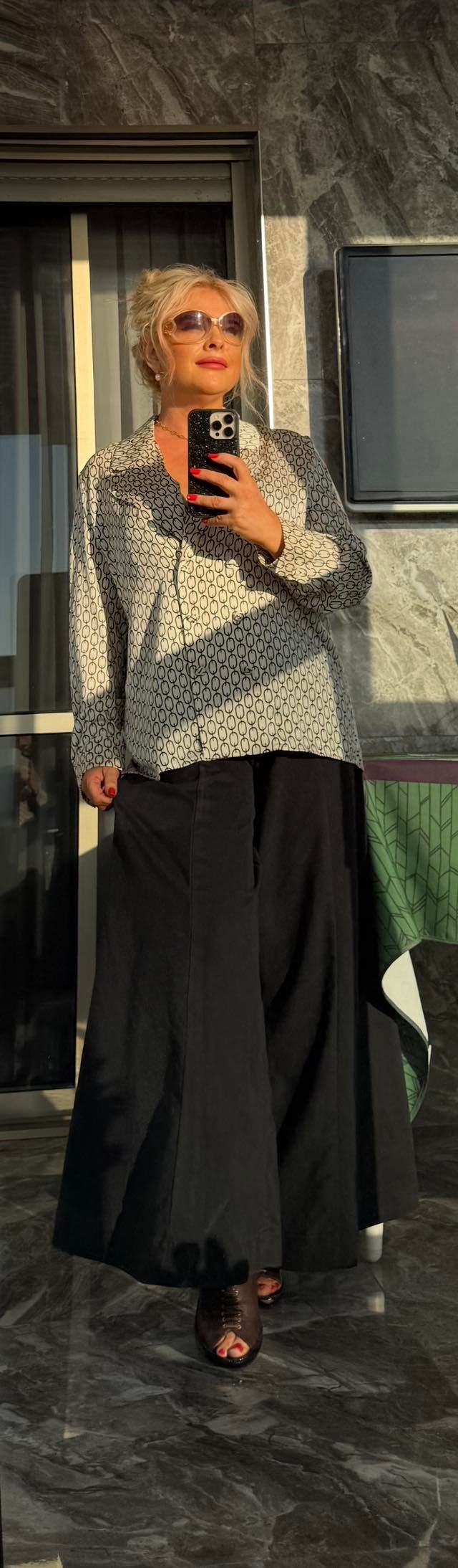 HE: ז’קט בעל מגע משיי והדפס שרשראות יוצר סטייטמנט אלגנטי. מתאים גם למכנסיים מחויטים, גם לג’ינס וגם מעל שמלה — בחירה ורסטילית ליום ולעֶרֶב. הגזרה הרפויה נעימה ללבישה ונופלת יפה.