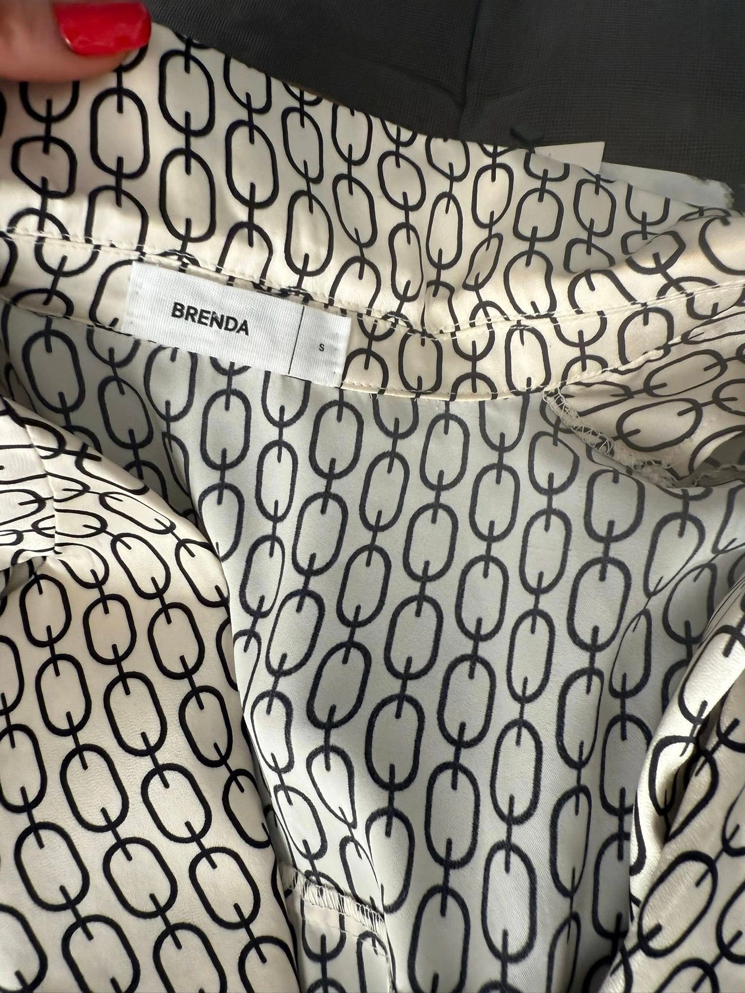 RU: Лёгкий пиджак с шелковистой фактурой и контрастным принтом-цепью создаёт элегантный акцент в образе. Носите с классическими брюками, джинсами или поверх платья-комбинации — универсальный вариант для офиса и вечерних выходов. Свободная посадка обеспечивает комфорт и красиво драпируется благодаря сатиновому блеску ткани.