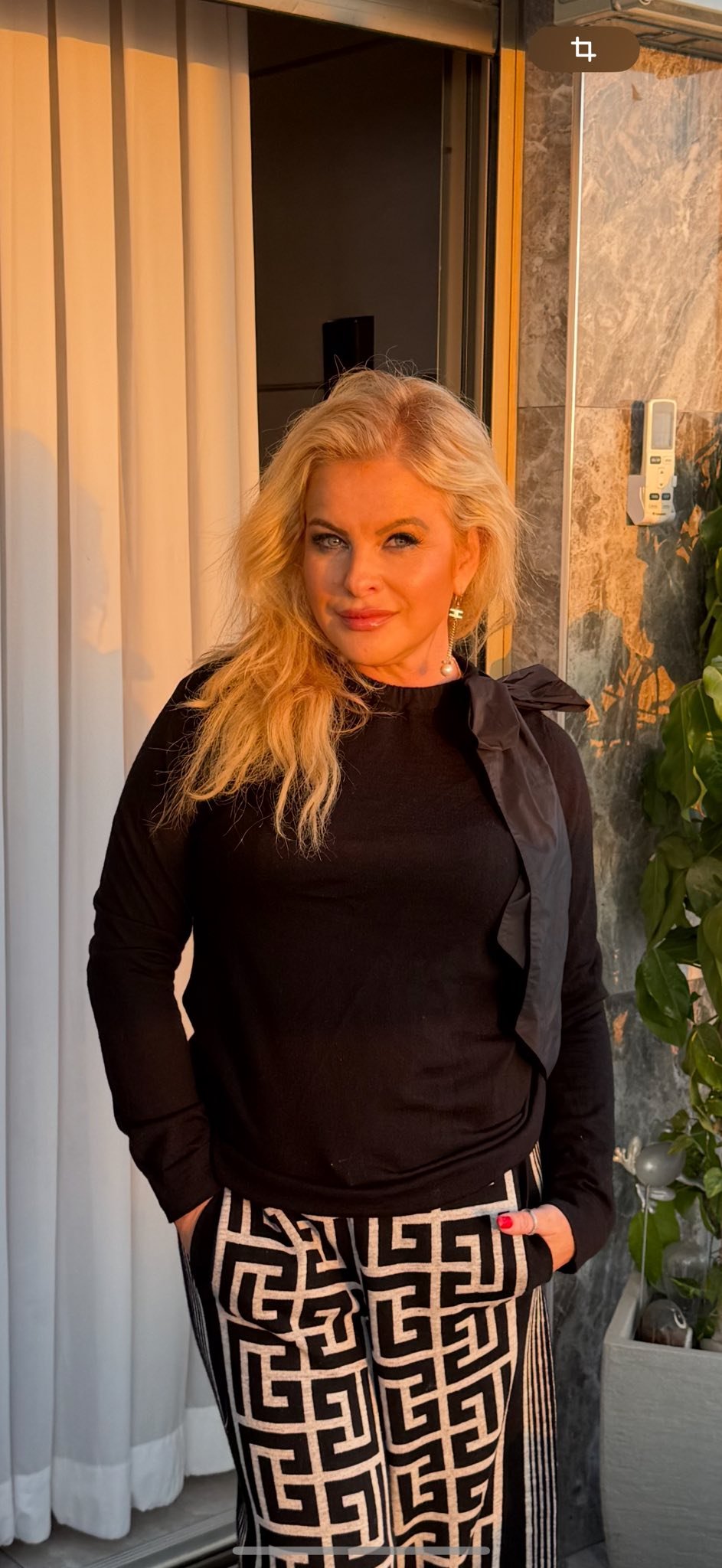 HE: סוודר שחור אלגנטי של ESCADA – פריט שמיד נראה יוקרתי ומדויק. סריג נעים שיושב יפה על הגוף, ופפיון דומיננטי באזור הצוואר שמוסיף שיק ואופי ללוק. מושלם לעבודה, פגישות ויציאות – כשבא לך טוטאל-בלאק עם טוויסט.