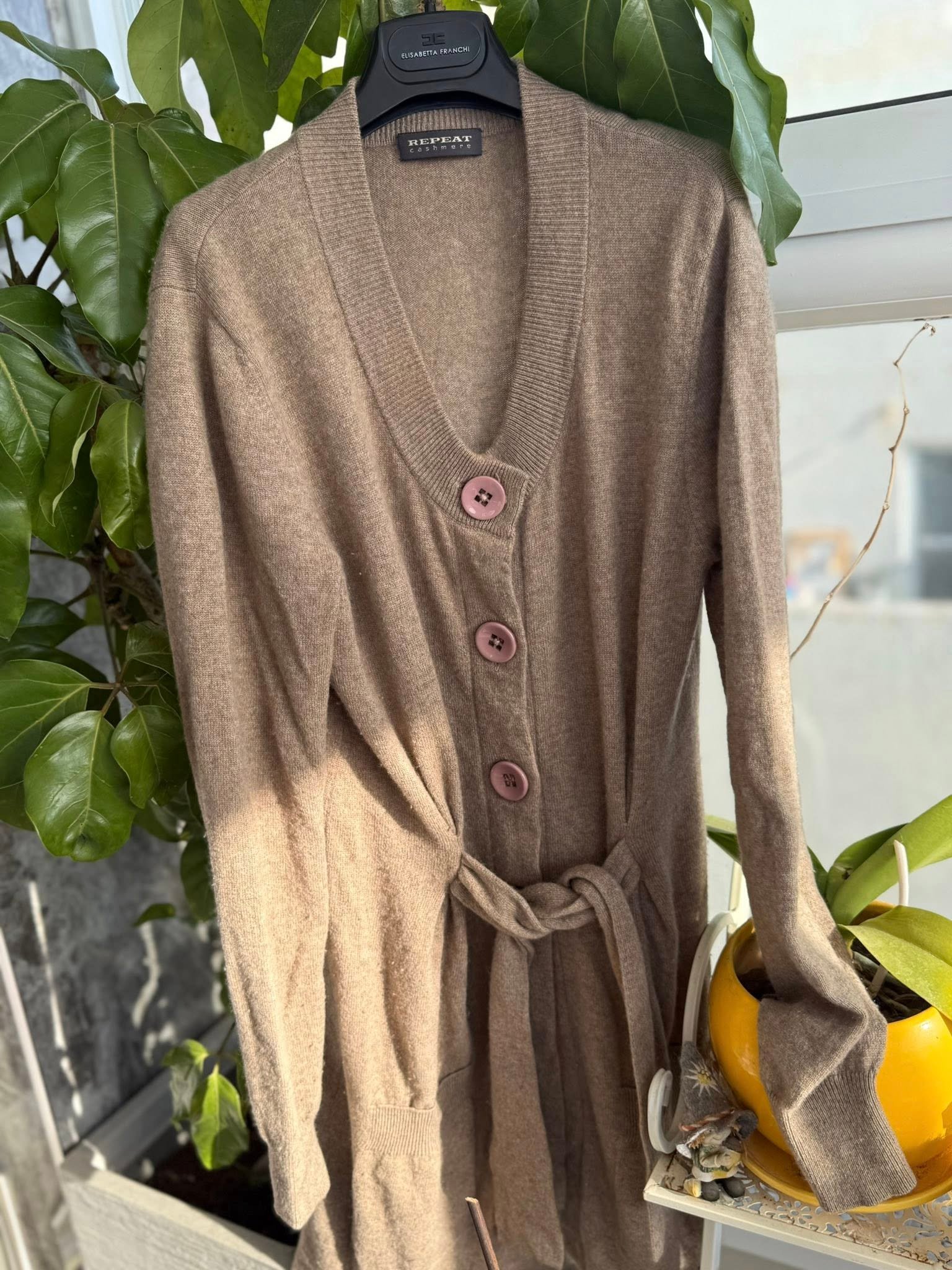 קרדיגן קשמיר רך בגוון קפוצ’ינו עדין, עם חגורה ומראה נשי קלאסי. מתאים לשילוב עם שמלות, ג’ינס או חולצות בסיס.