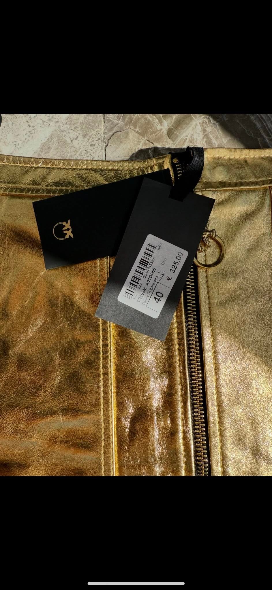 RU: Золотая кожаная юбка Pinko в эффектном металлике — тот самый fashion-акцент, который делает образ «как с подиума». Молния по центру и кольцо-пуллер добавляют характер. С бирками — идеальна для ярких выходов.