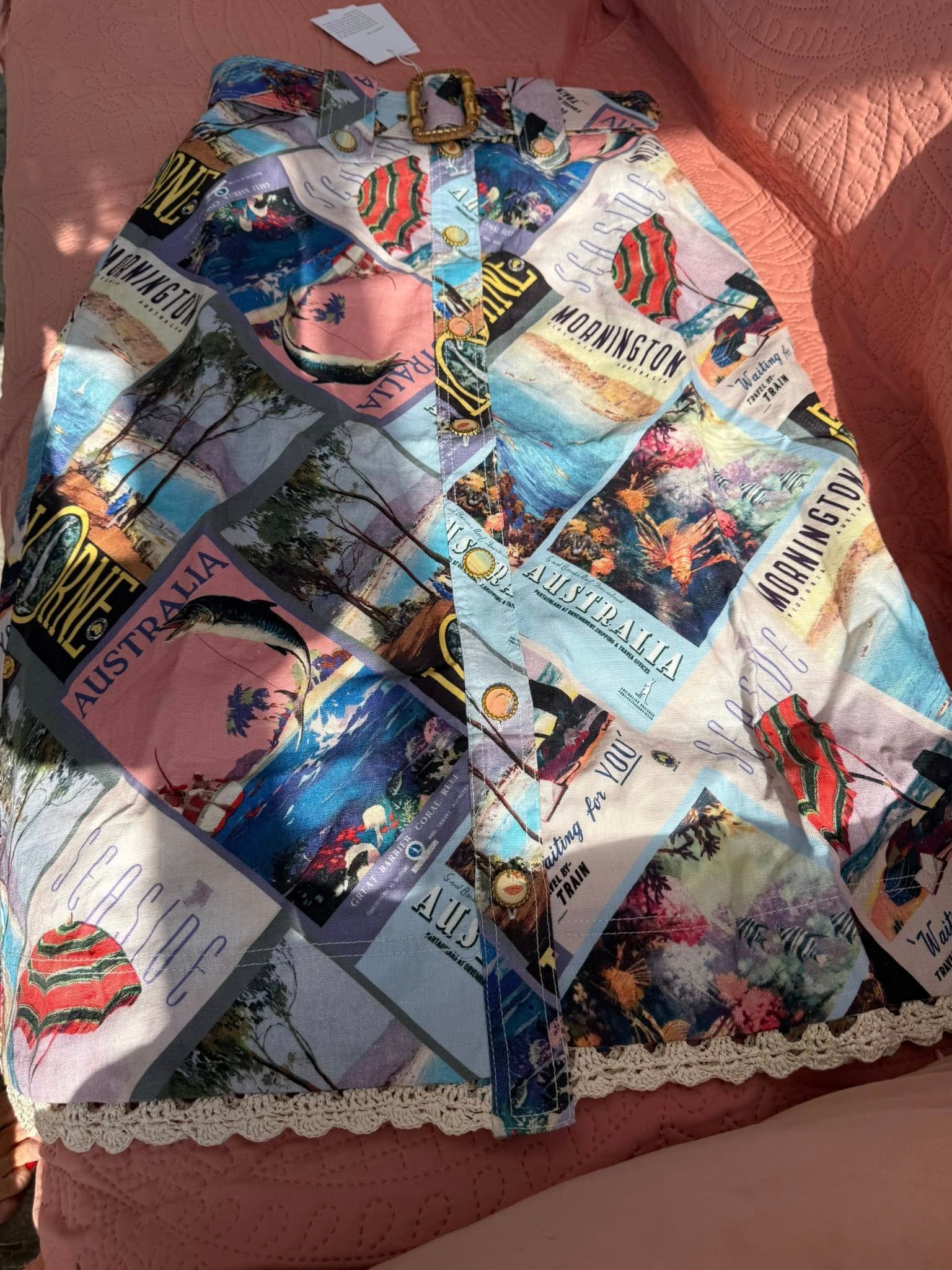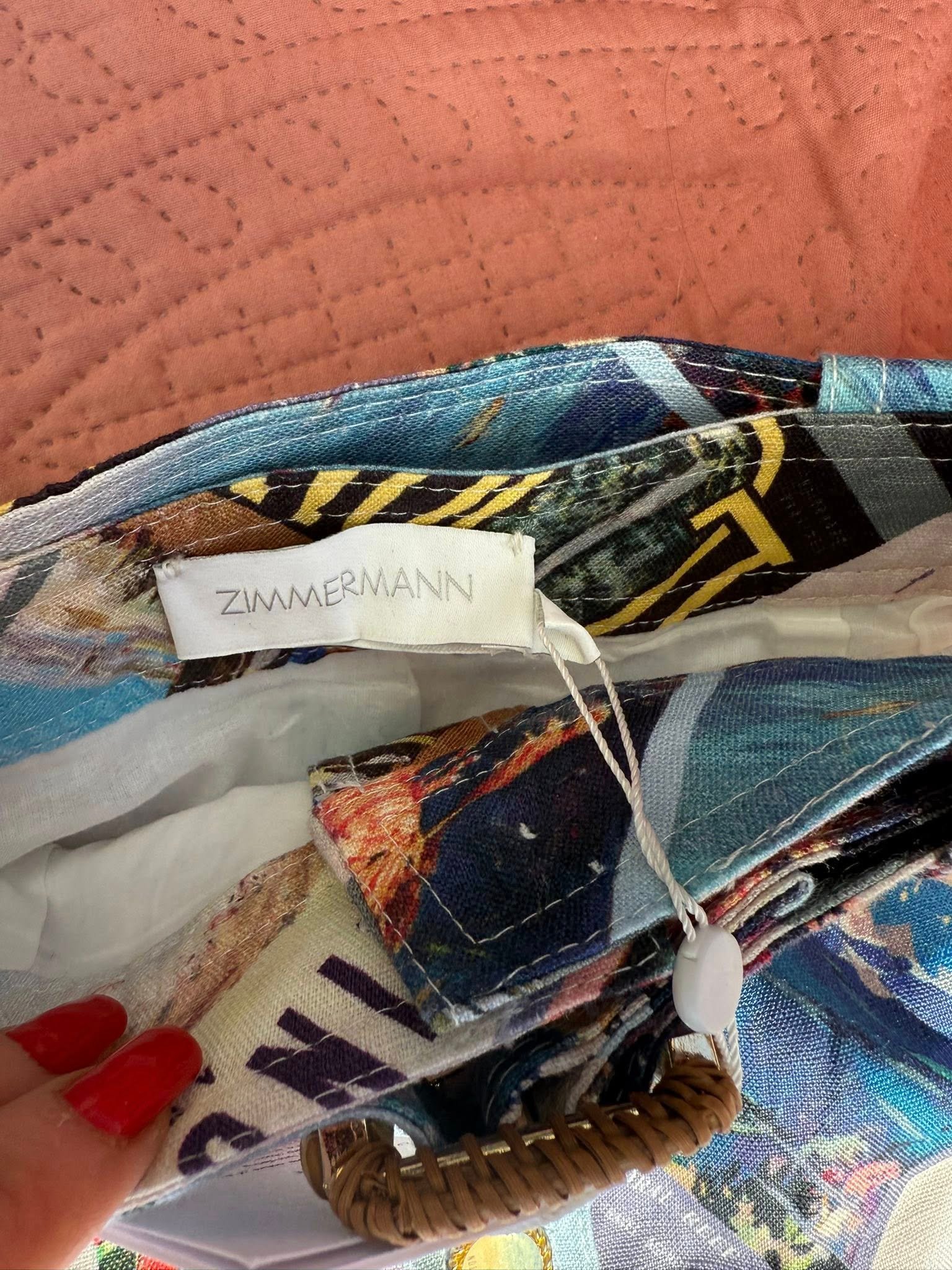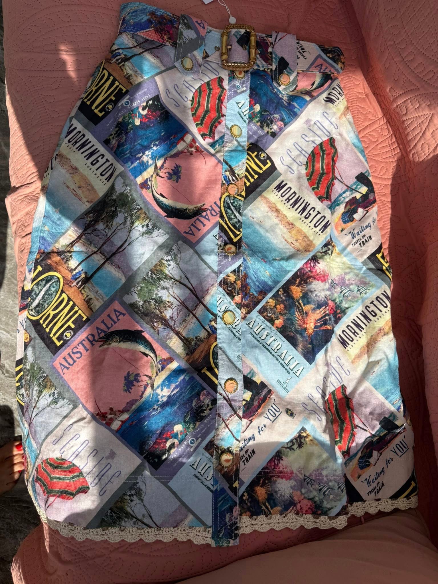 RU: Легендарная юбка Zimmermann Postcard с ярким принтом «открыток» — это настоящая жемчужина летнего гардероба. Уникальный рисунок с пейзажами и надписями переносит в атмосферу путешествий, а кружевная отделка и пояс с изысканной пряжкой добавляют элегантности. Идеальна как для дневных прогулок, так и для вечерних образов.
