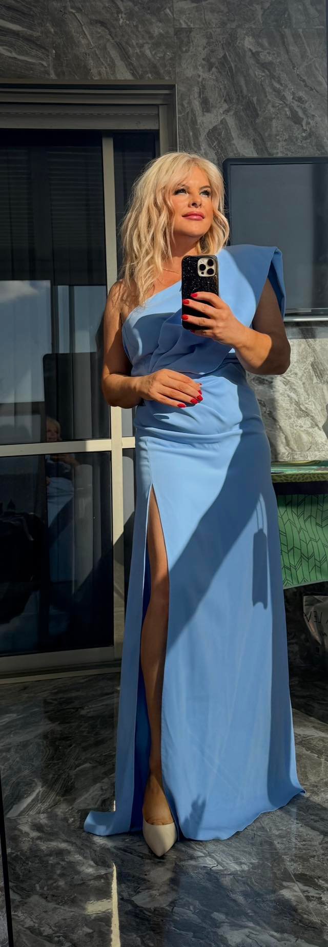 HE: שמלת ערב תכלת בתפירה אישית, עם כתף אסימטרית ודרייפינג מחמיא במותן. השסע הגבוה יוצר נוכחות אלגנטית ומודרנית. מושלמת לאירוע מיוחד, נשף או חתונה.