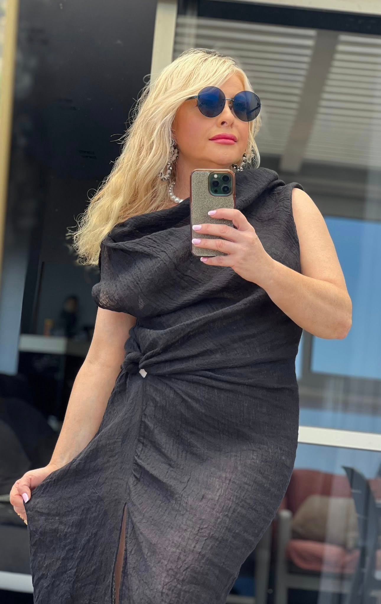 שמלת פשתן שחורה, ארוכה, מחמיאה ומלאת שיק נקי. מתאימה לים / ערב / אירוע / חופשה / יציאה תרבותית.
