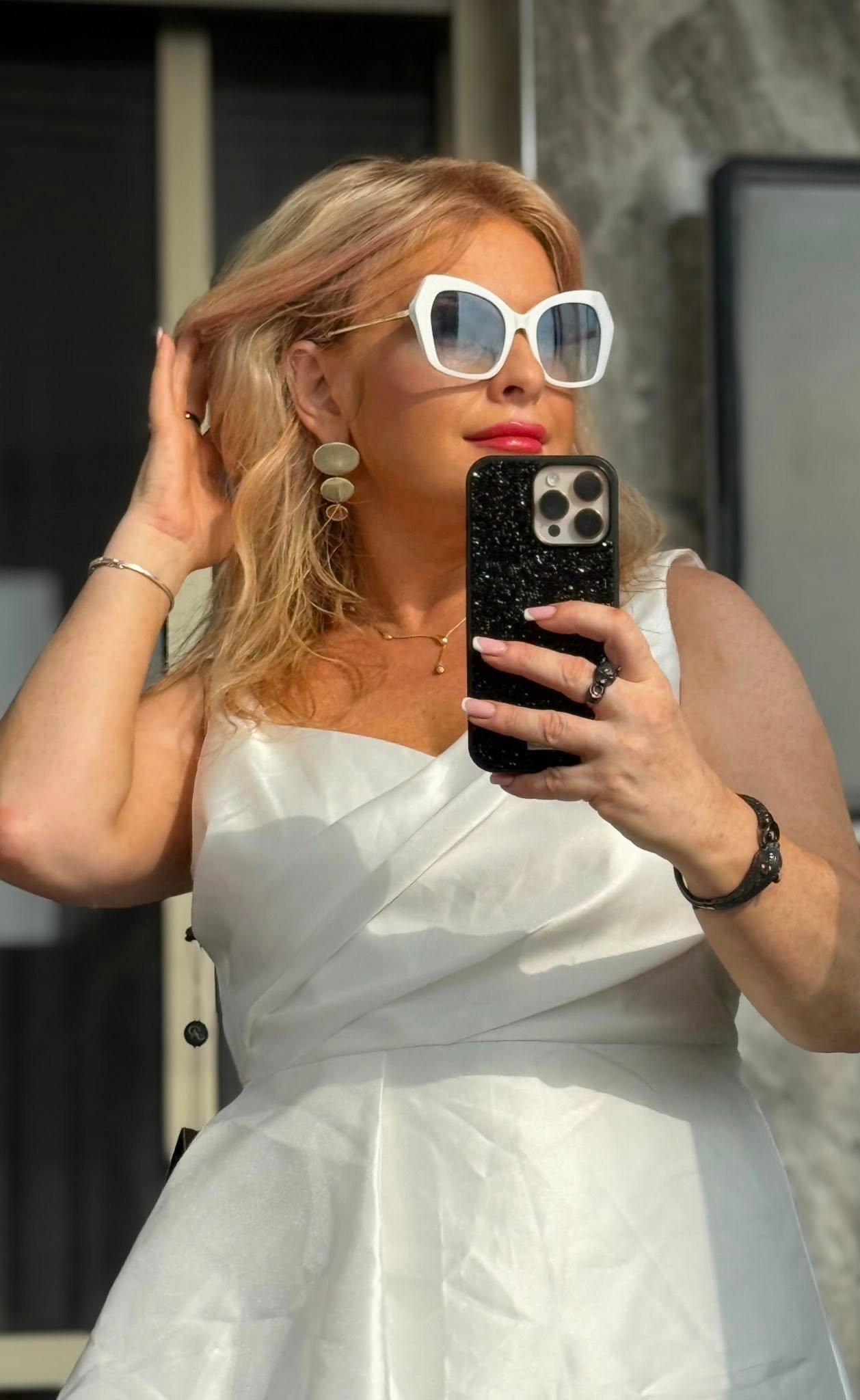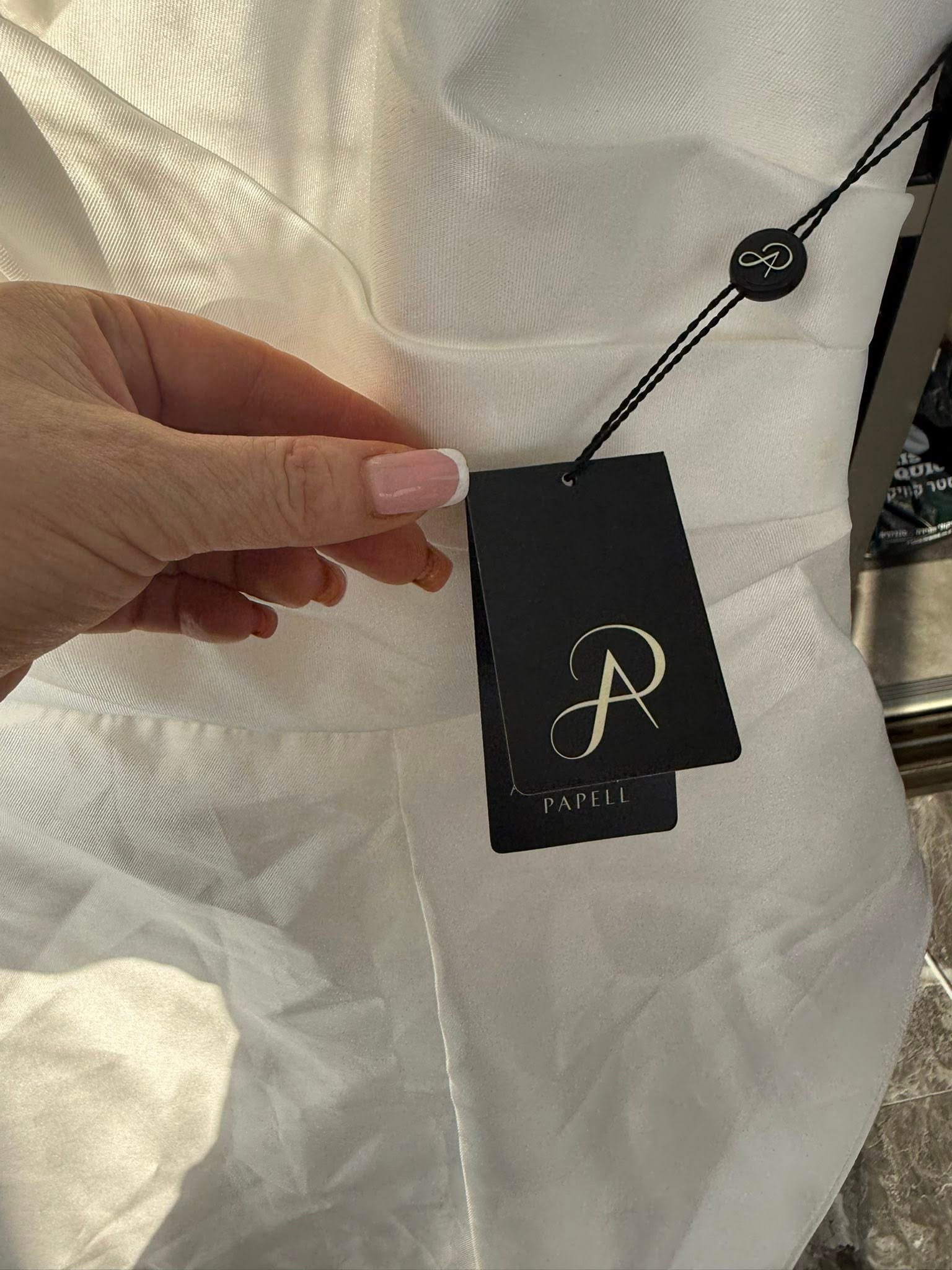 HE: שמלה לבנה מרשימה של Adrianna Papell עם דרפה א-סימטרית בחלק העליון וחצאית פליסה אוורירית עד הרצפה. גזרה נשית ומחמיאה — מושלמת לאירועים, קבלת פנים או ערב. חדשה עם תגים.
