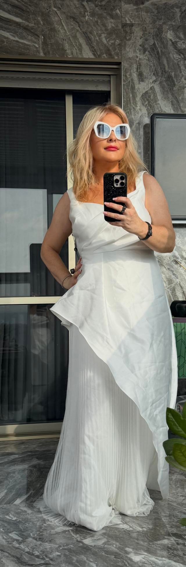 Adrianna Papell — белое платье в пол с асимметричной драпировкой и плиссированной юбкой — 600 ₪ | Adrianna Papell — שמלה לבנה ארוכה עם דרפה א-סימטרית וחצאית פליסה — 600 ₪ | Julia Raskin Style