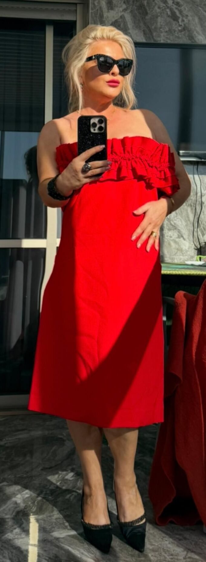 RU: Красное платье Anne Fontaine — символ страсти, силы и утончённой элегантности. Модель Petunia с бархатистыми воланами по линии плеч красиво открывает зону декольте, а плотная креповая ткань держит форму и подчёркивает силуэт. Идеально для особых случаев, коктейля и летних вечеров.