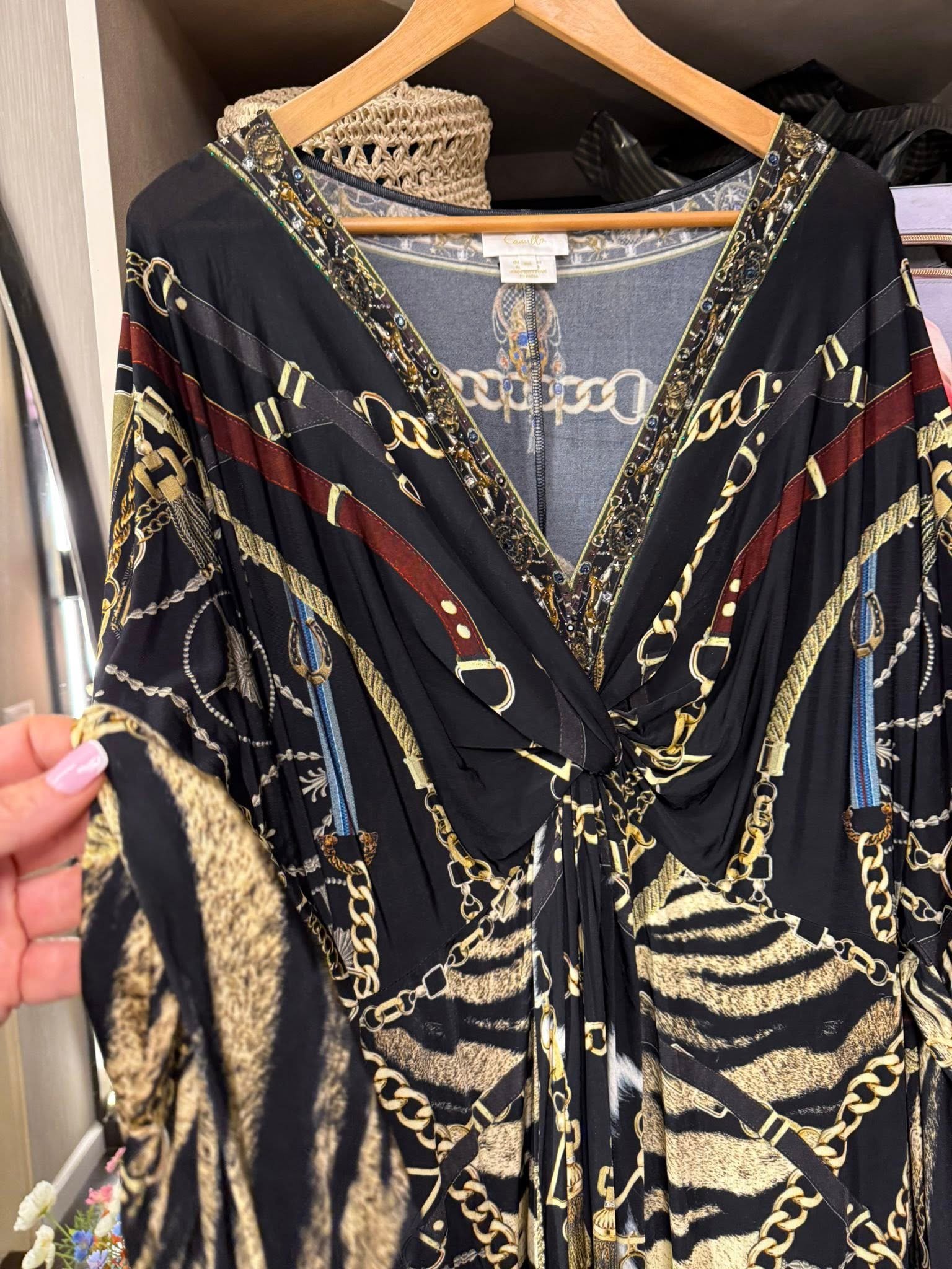 שמלה ארוכה ומרהיבה של המותג האוסטרלי Camilla, עם הדפס שרשראות וזהב, גזרה נשית מחמיאה ואבני סברובסקי זוהרות. מושלמת לערב חגיגי, אירועים או חופשה חלומית.