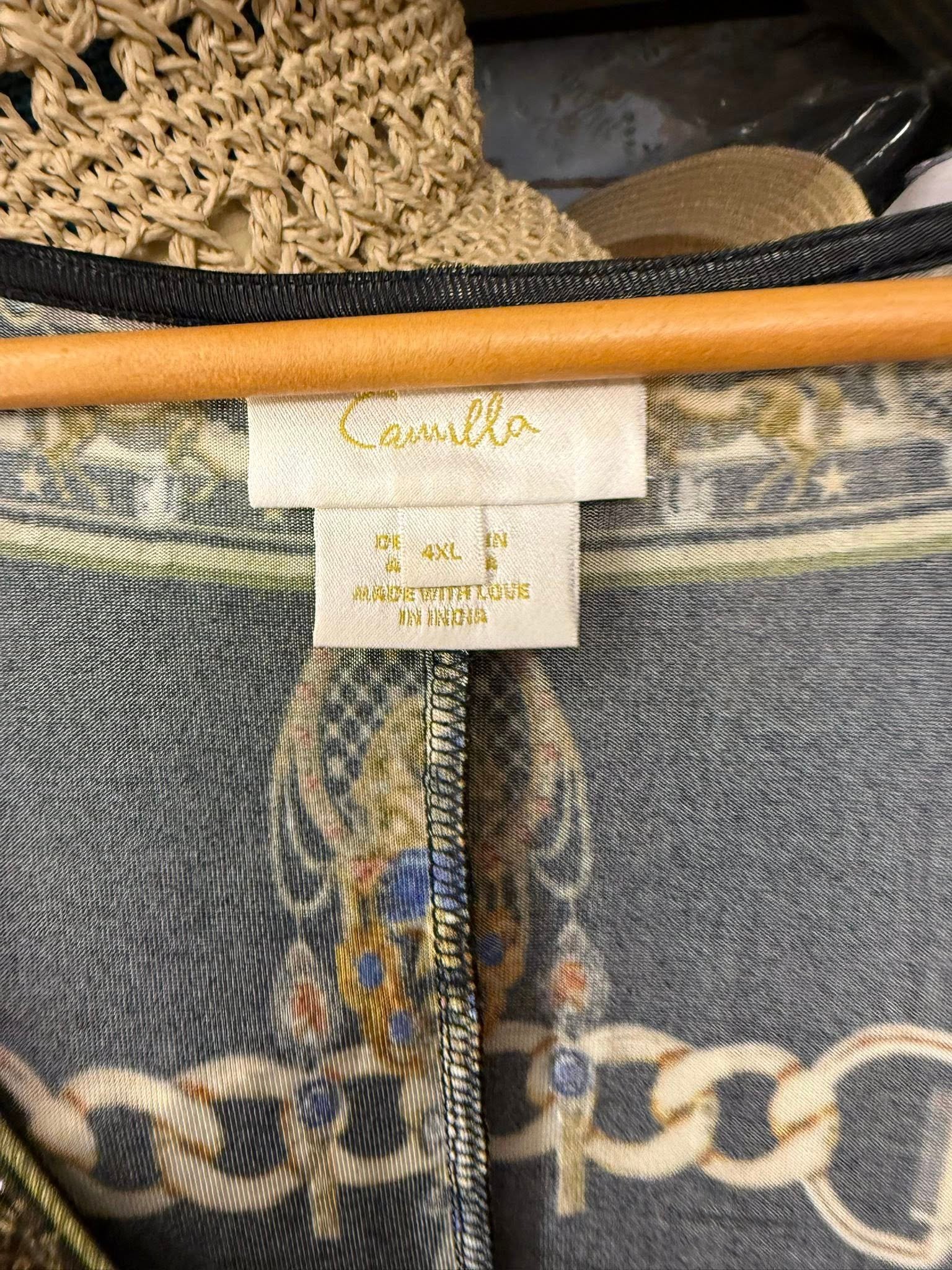 Потрясающее длинное платье Camilla — настоящий шедевр бренда! Глубокий V-вырез, расшитый кристаллами Swarovski, изысканный принт в стиле барокко с цепями, ремнями и анималистичными акцентами создают ощущение богатства и уверенности. Модель свободного кроя с эффектом драпировки прекрасно подходит для большого размера (4XL), подчёркивая силуэт и оставаясь комфортной. Идеально для вечерних мероприятий, торжеств или модных ужинов 💫.