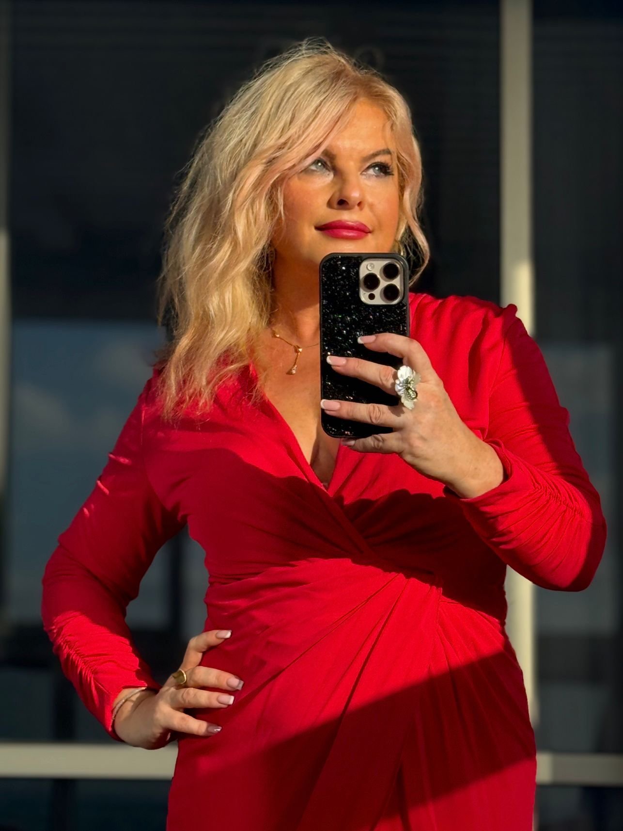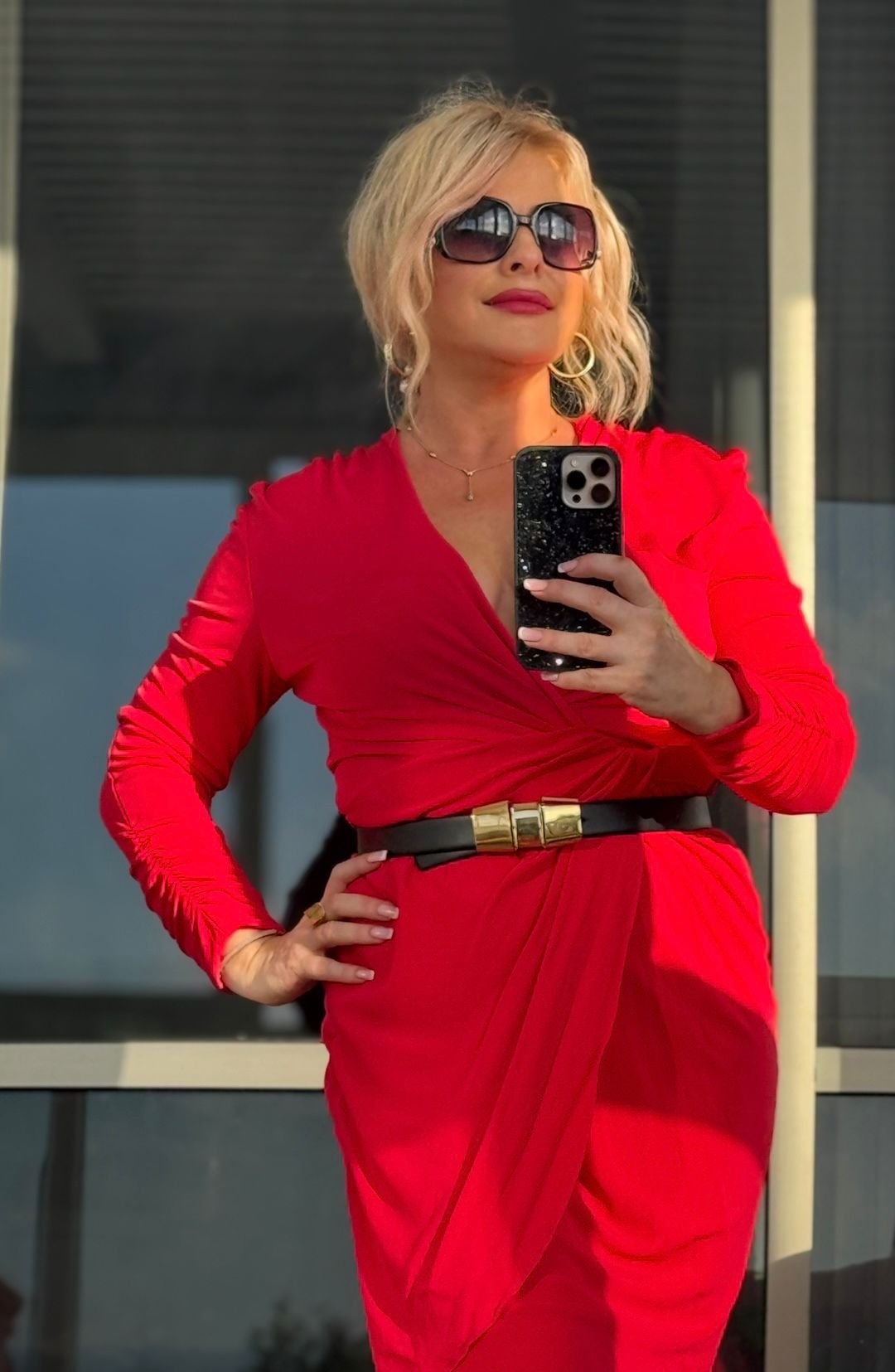 HE: שמלה אדומה מרהיבה של Karen Millen עם קשירה דרייפית המחמיאה לגזרה. הבד האלסטי יושב מושלם על הגוף — מושלם לדייט, אירוע או ערב קוקטייל עם עקבים וקלאץ’ זהב.