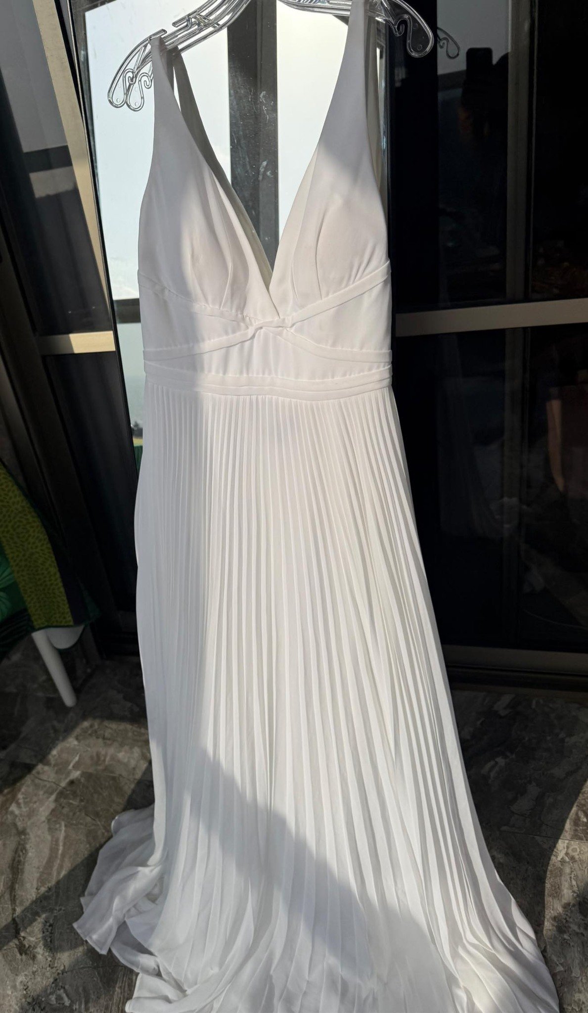 RU: Эфирное белое платье-макси Laundry by Shelli Segal с плиссированной юбкой. Лиф с V-вырезом и аккуратными складками визуально формирует талию, а высокий крой по линии empire и лёгкая ткань красиво струятся при ходьбе. Идеально для выпускного, вечеринки у моря или civil-свадьбы.