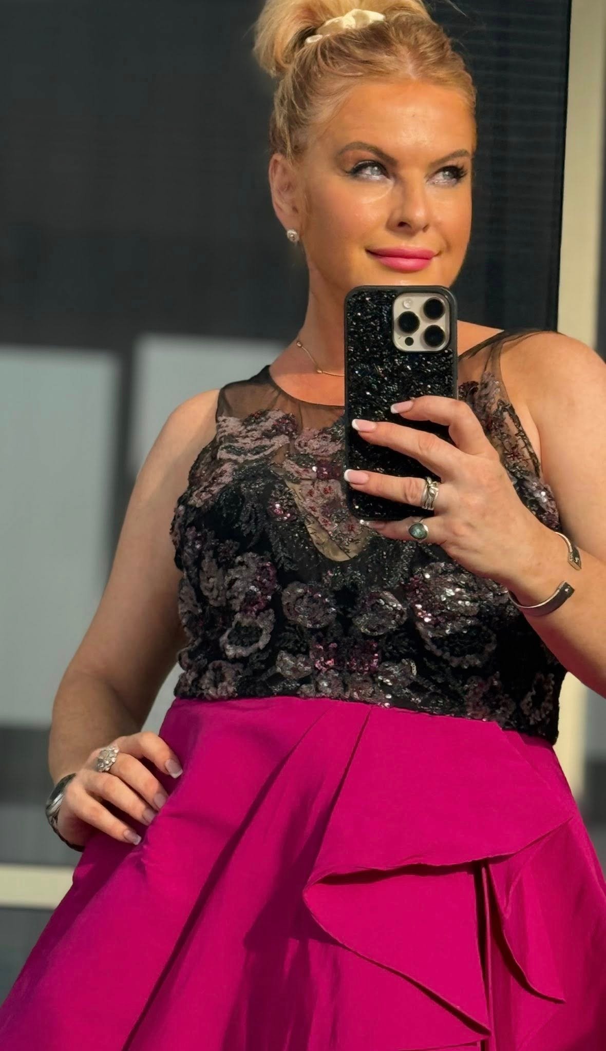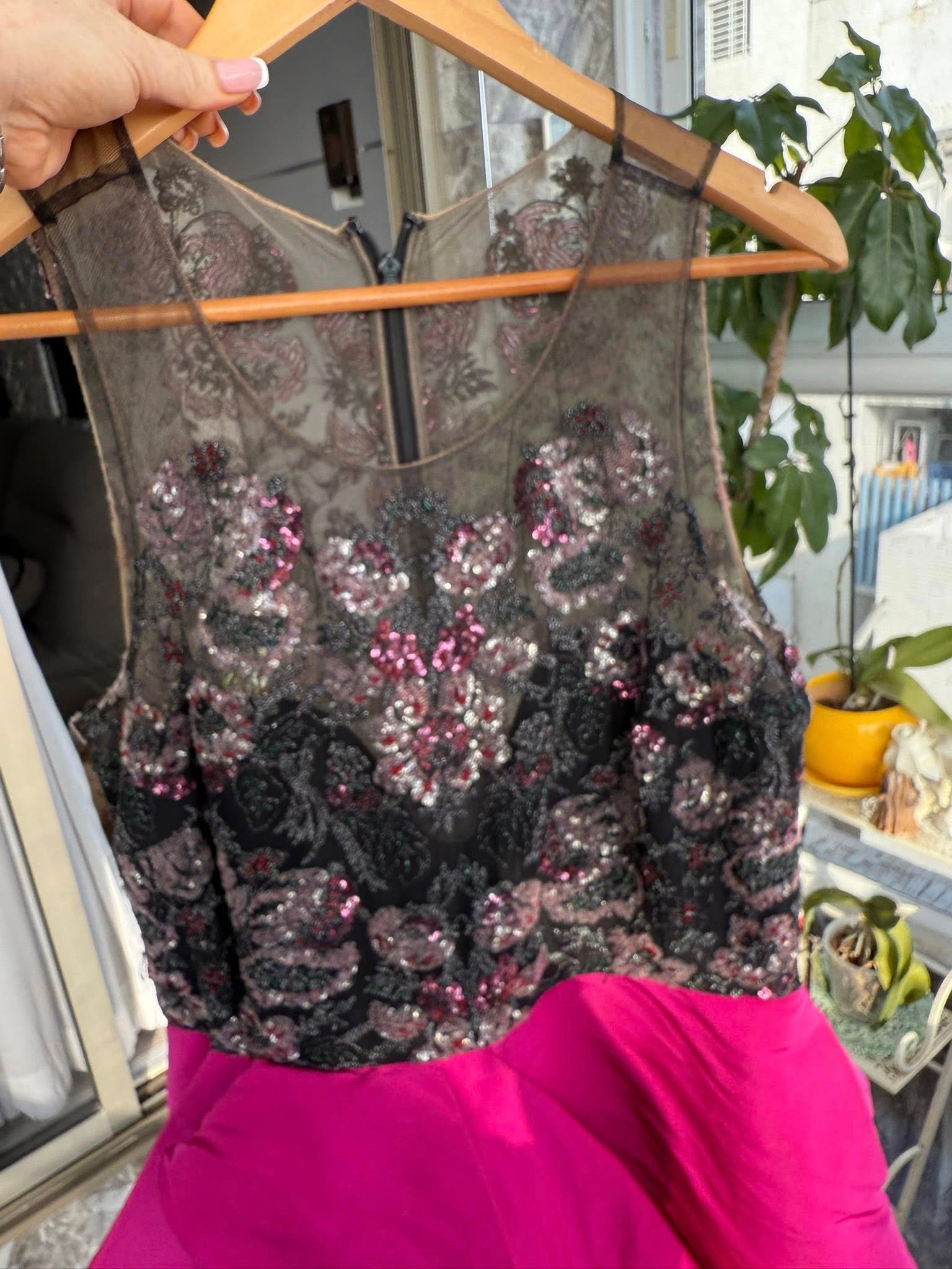 RU: Праздничное платье Marchesa Notte с лифом-«иллюзией» из сетки, расшитой цветами и пайетками. Структурированная юбка цвета фуксии с асимметричной драпировкой добавляет объёма и движения. Идеально для торжеств и особых случаев.