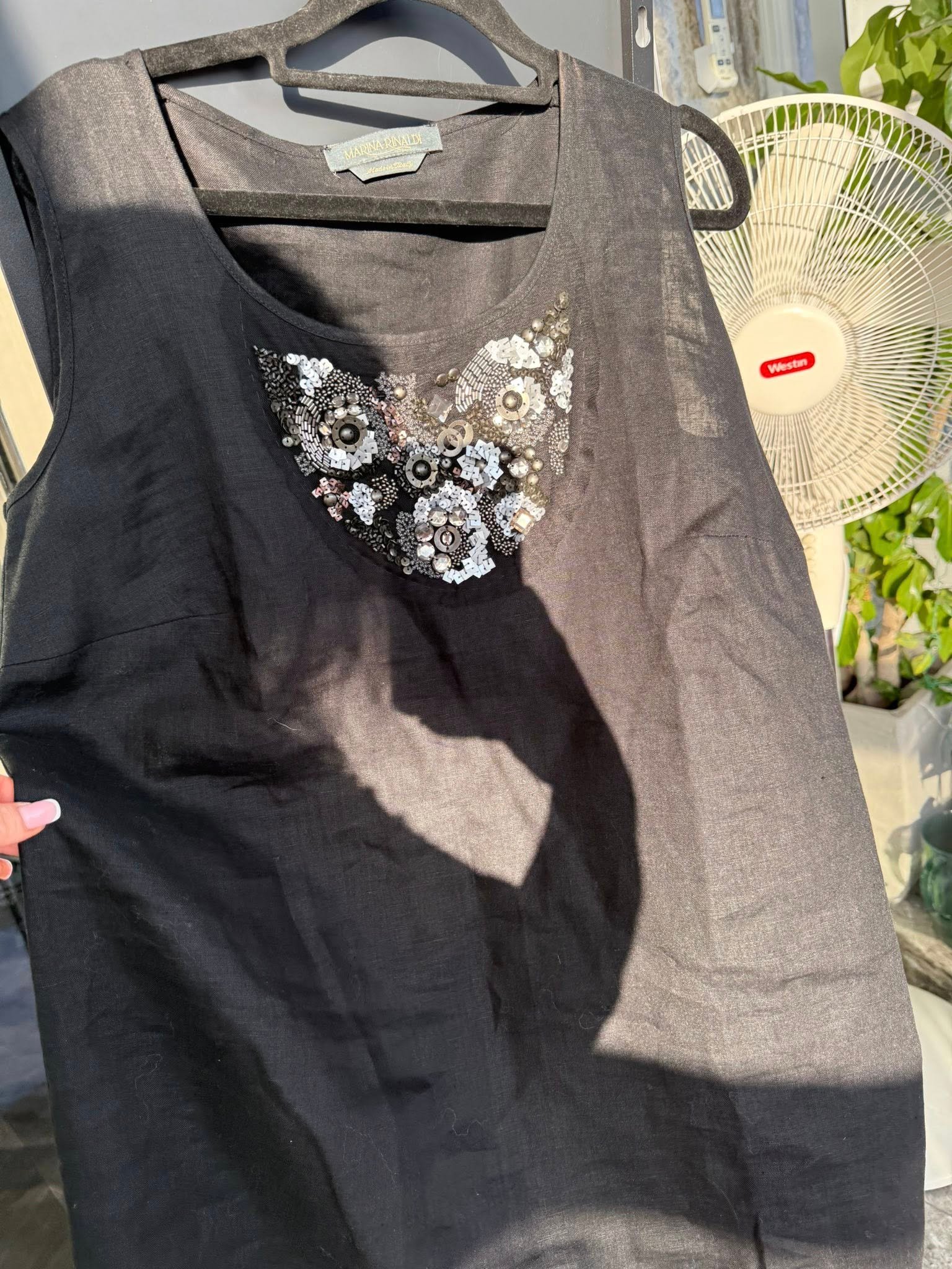 RU: Лаконичное чёрное платье из натуральной фактуры с акцентом на горловине — ручной декор бусинами и пайетками.