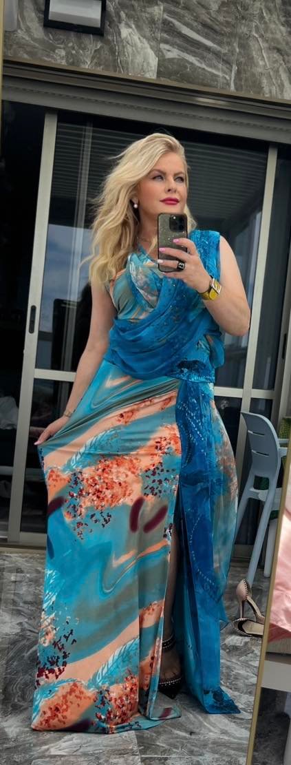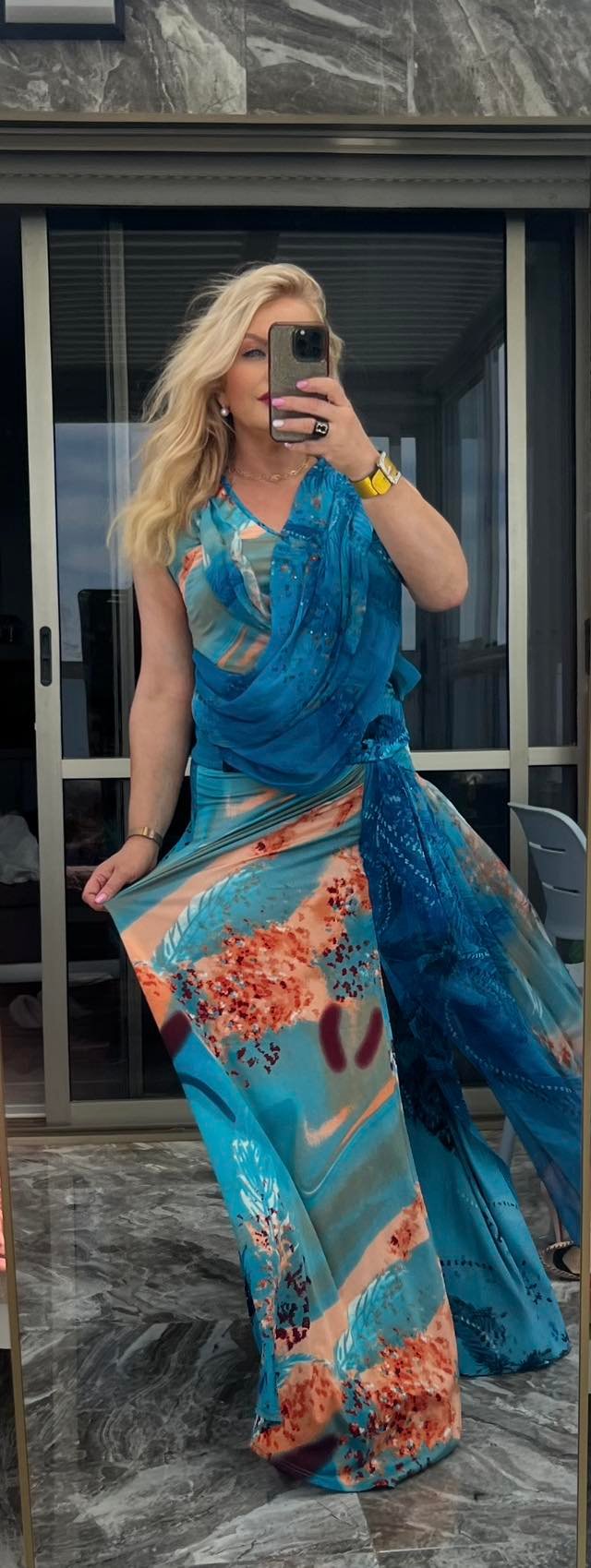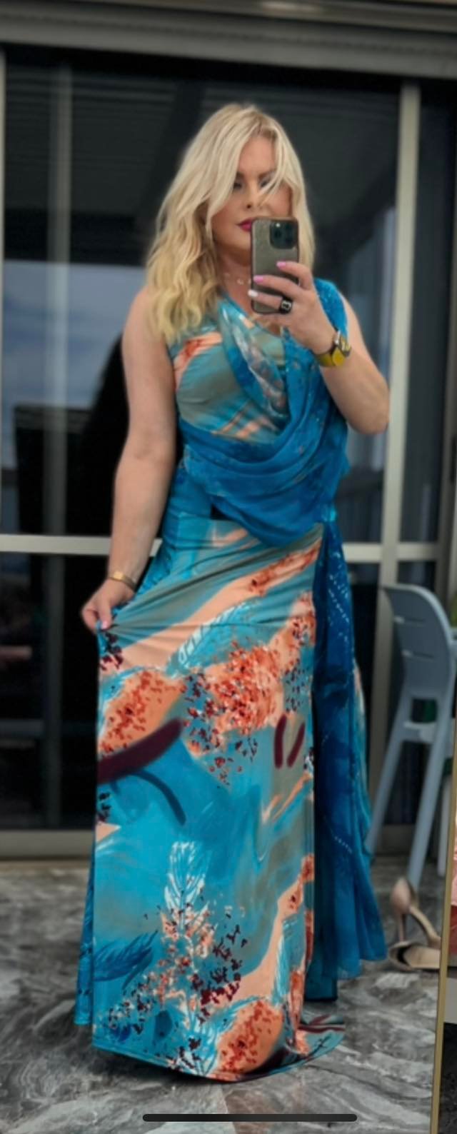 Orna Farho — шифоновое платье с накидкой (абстрактный океан, бирюза/коралл), размер M–L — 550 ₪ | Orna Farho — שמלת שיפון עם שכמייה (הדפס אוקיינוס, טורקיז/קורל), מידה M–L — 550 ₪ | Julia Raskin Style