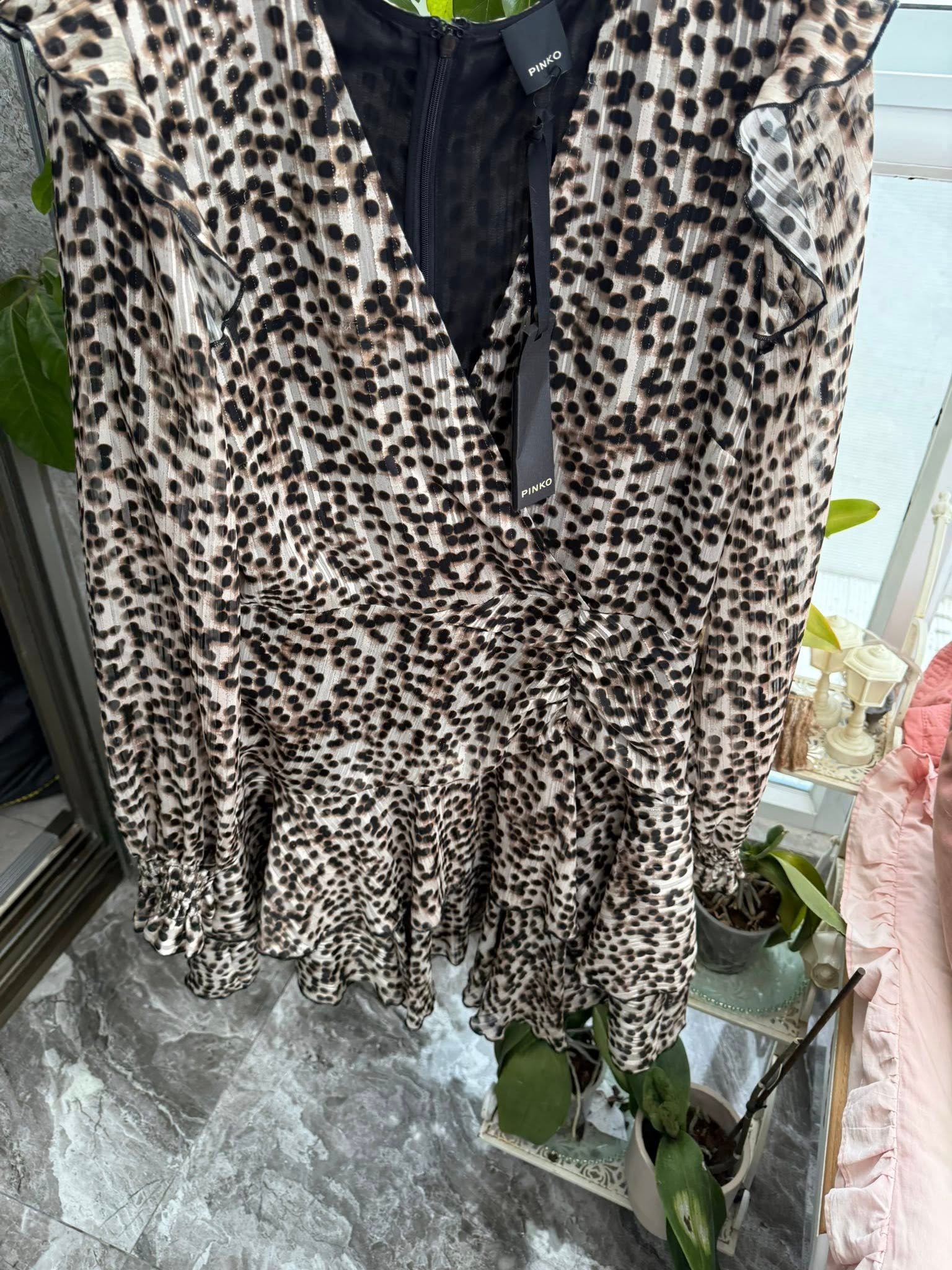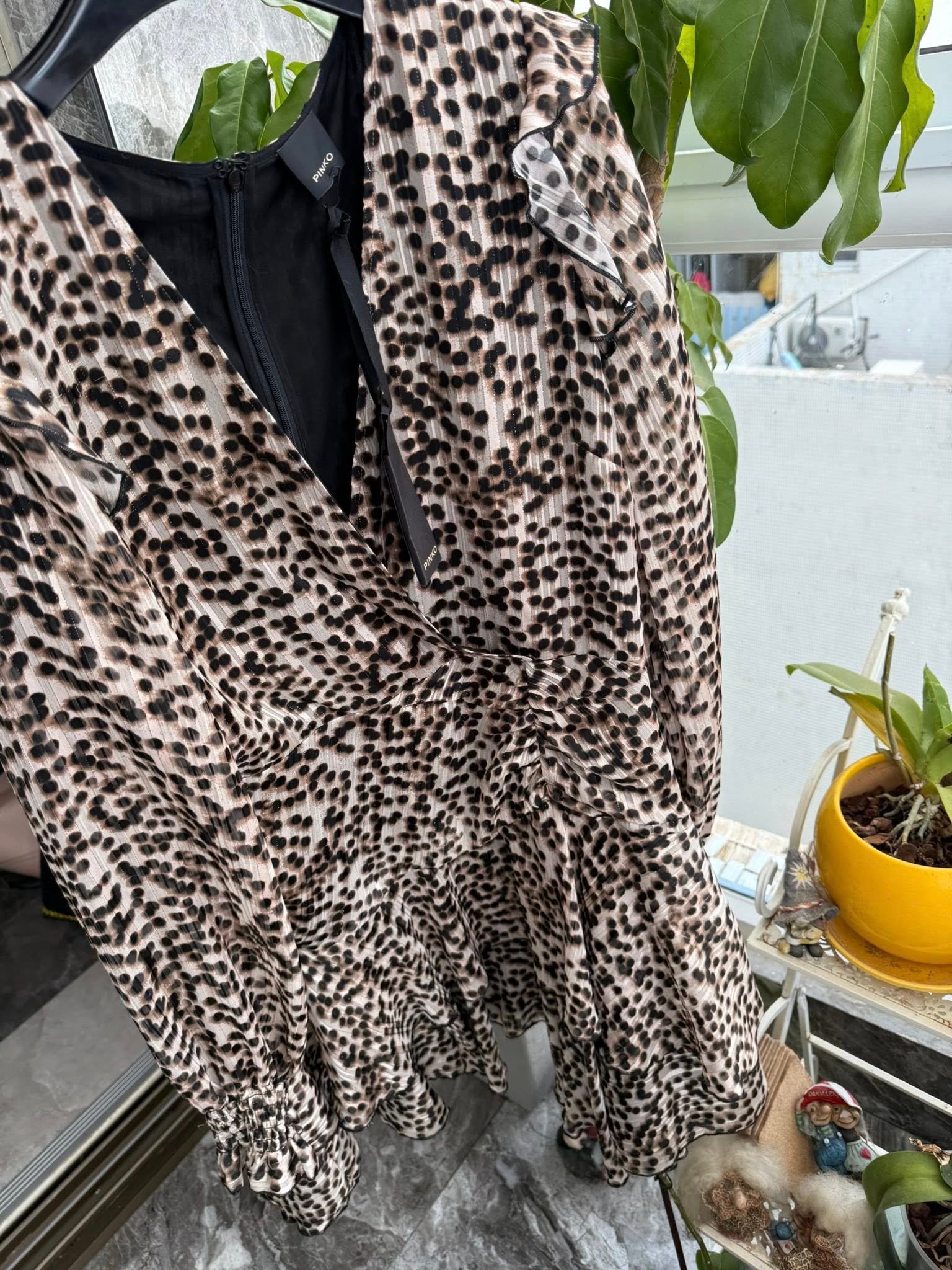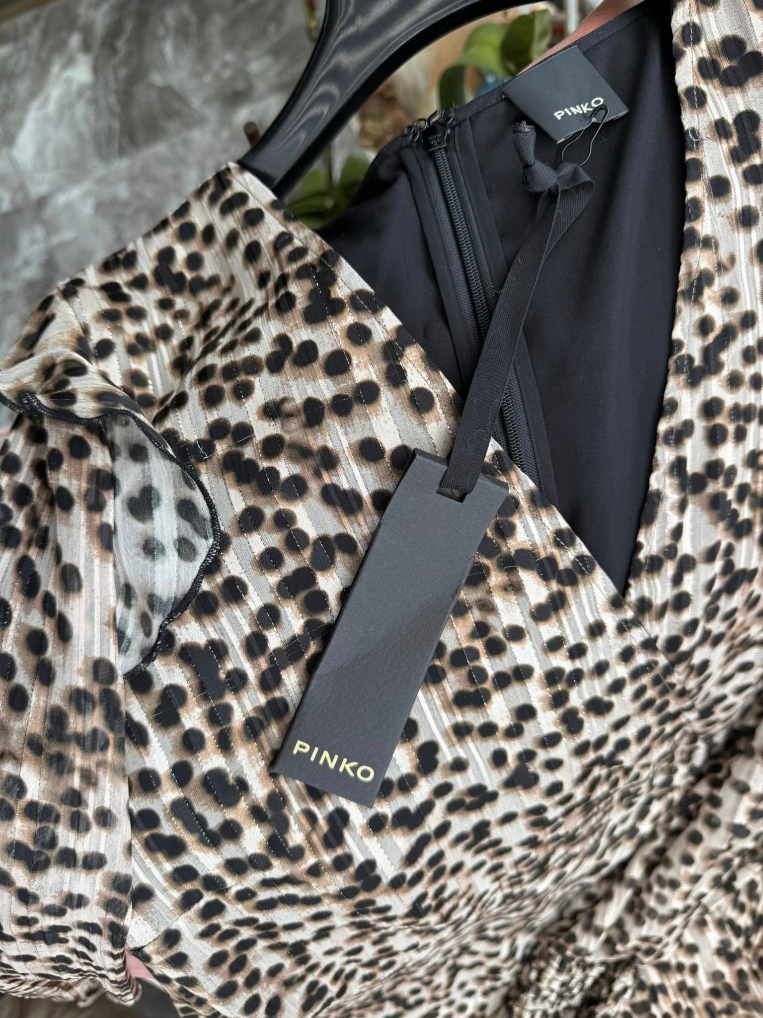 Элегантное платье с современным “леопардовым” принтом в стиле PINKO: нежная плиссировка, глубокий красивый вырез и продуманный крой, который подчёркивает талию и создаёт легкое женственное движение при ходьбе. Платье идеально подходит для вечера, праздника, свидания или стильного дневного выхода. Абсолютно новое, с бирками. Размер M.