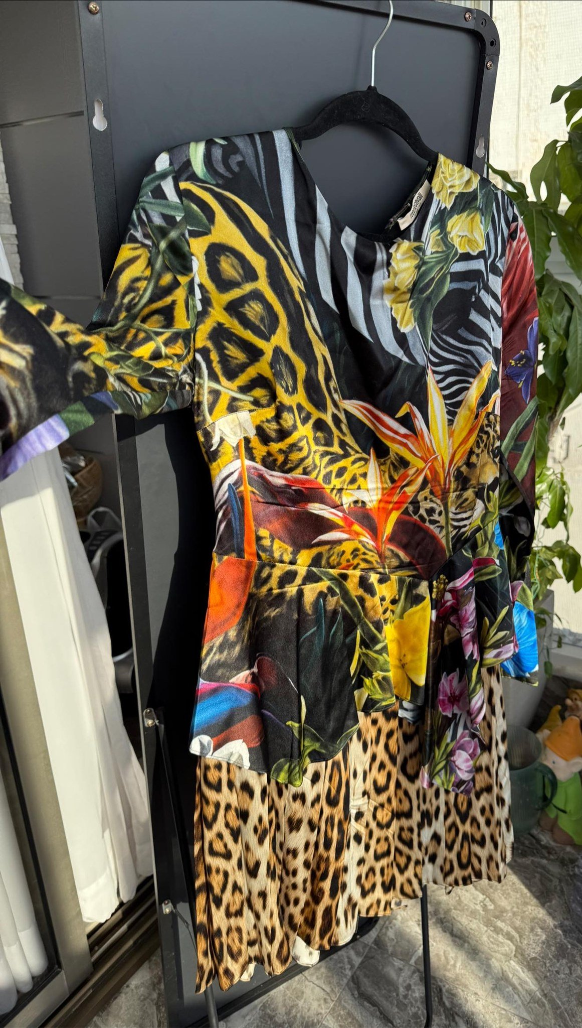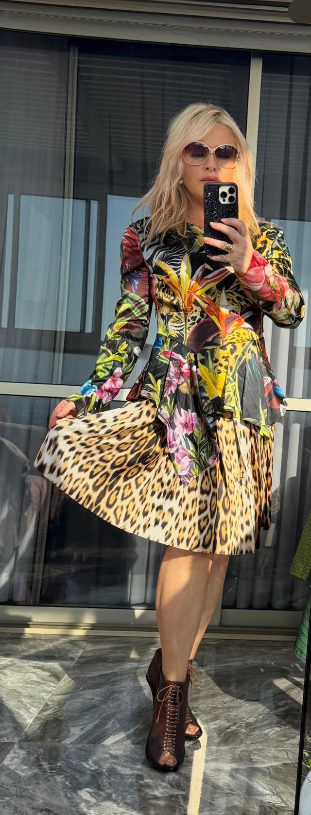 RU: Платье Roberto Cavalli — смелая интерпретация женственности: насыщенные тропические мотивы встречаются с дерзким леопардом и зеброй. Приталенный верх подчёркивает талию, а расклёшенная плиссированная юбка красиво движется при ходьбе. Идеальный выбор для выхода, когда нужен эффект «вау» без компромиссов по элегантности.