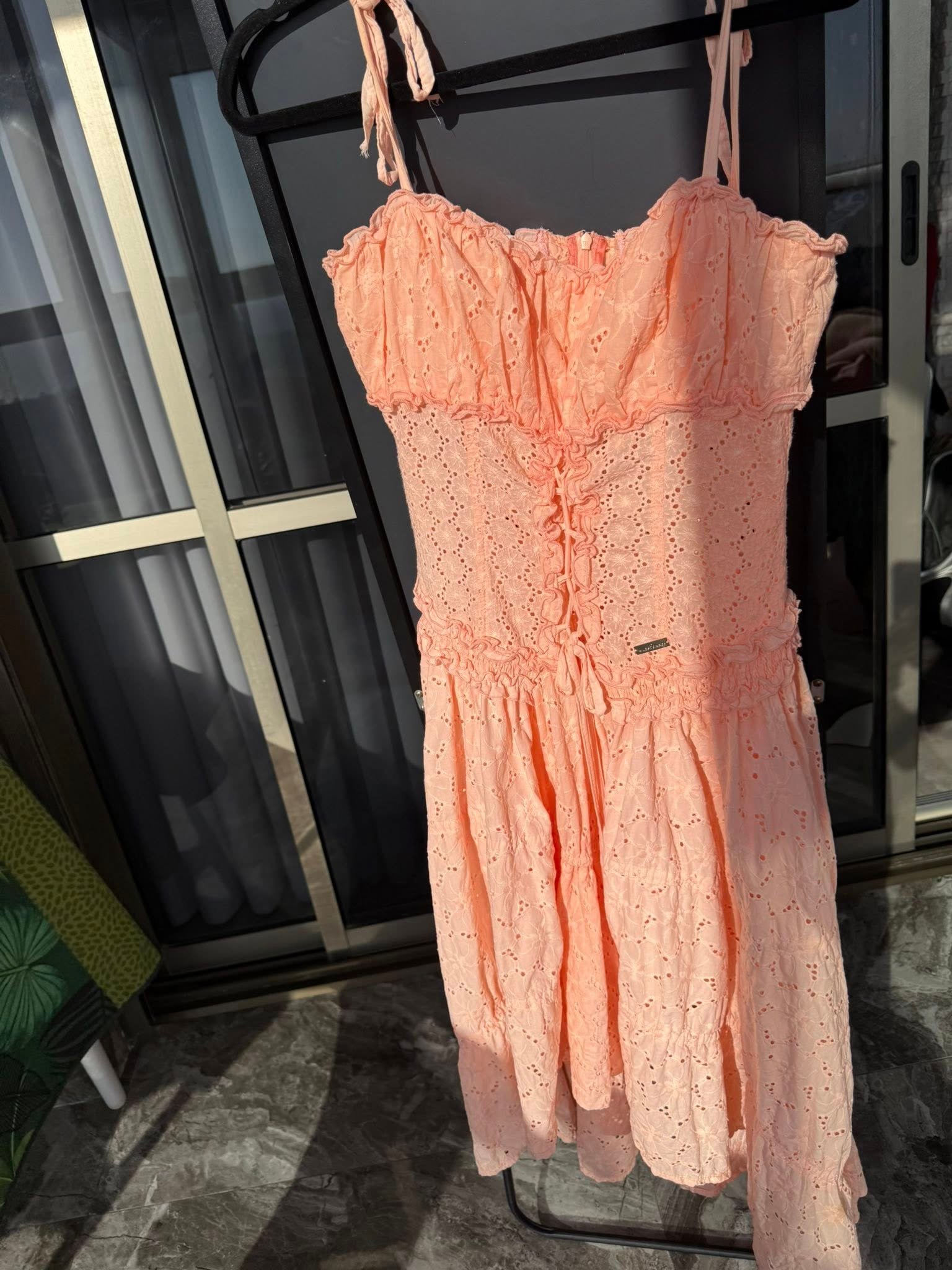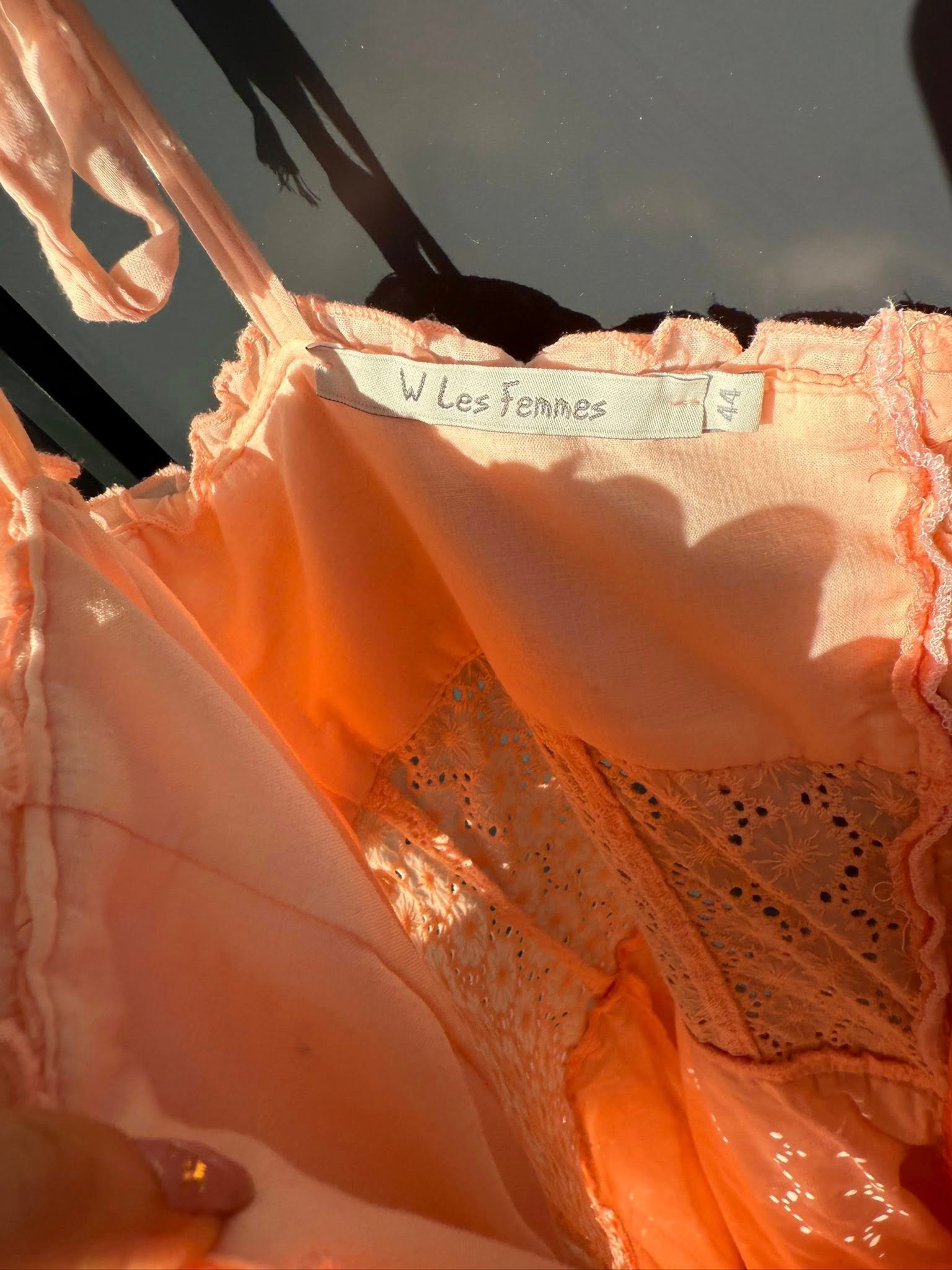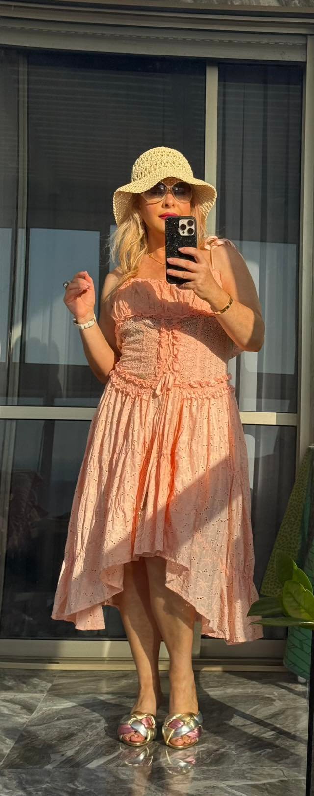 RU: Нежное летнее платье в оттенке персика, выполненное из лёгкой ткани с ажурной вышивкой. Регулируемые бретели и шнуровка спереди позволяют подстроить посадку, присборенная талия подчёркивает силуэт, а асимметричный подол красиво двигается при ходьбе. Идеально для города, отпуска и вечеринок на открытом воздухе.