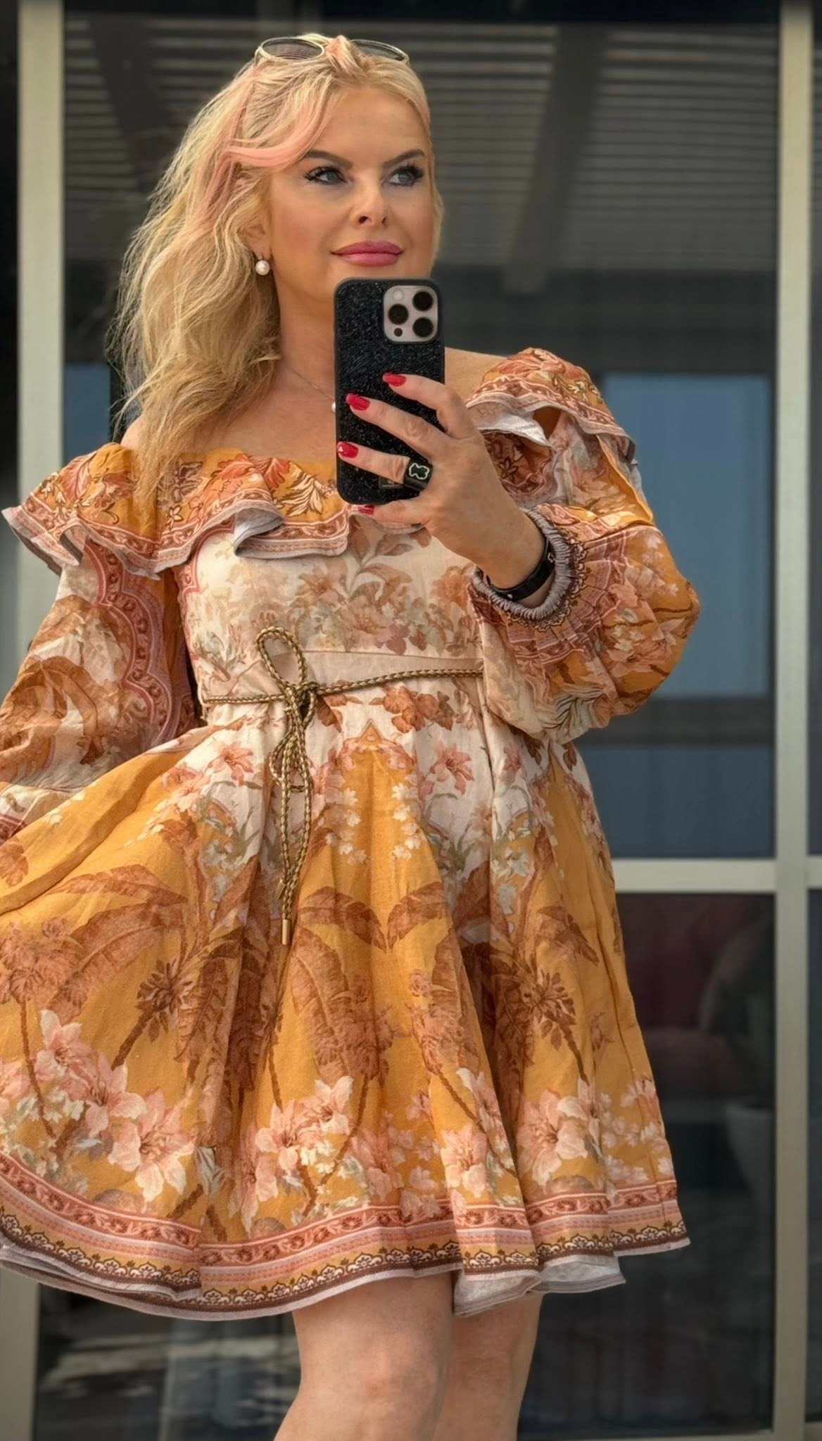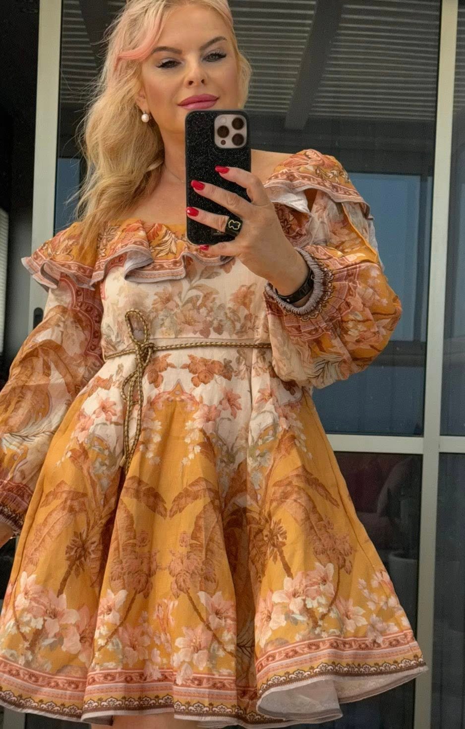 HE: שמלת מיני אלגנטית של Zimmermann בגווני סתיו חמימים. הבד הקל והגזרה המדויקת מחמיאים לגוף, והרפלות מוסיפות רומנטיקה. מושלמת לאירועים מיוחדים ולטיולים אופנתיים בכל שעה ביום.