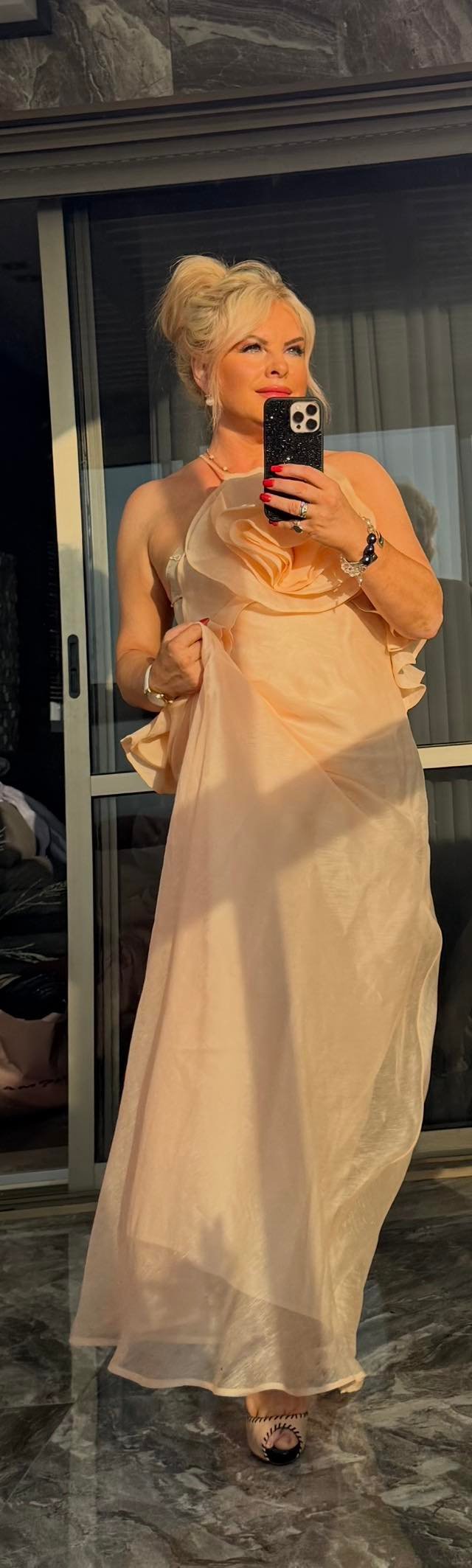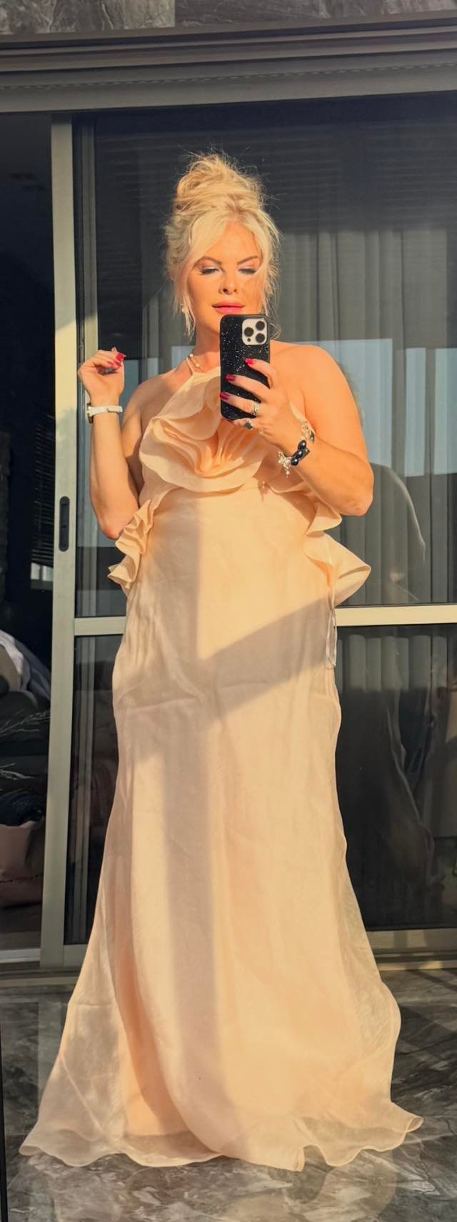 RU: Персиковое платье Zimmermann — воплощение лёгкости и романтики. Нежная палитра освежает, воланы красиво обрамляют линию декольте и плеч, а струящийся силуэт придаёт образу воздушность. Сочетайте с нюдовыми босоножками и жемчужными серьгами — идеальный лук для летнего торжества, прогулки у моря или особого вечера.