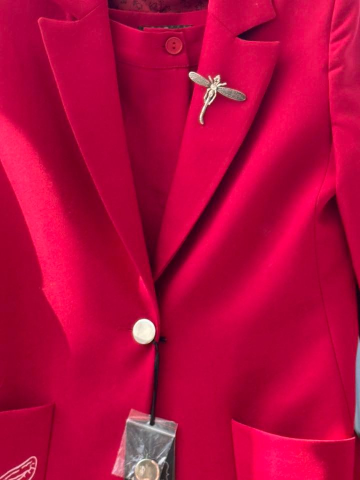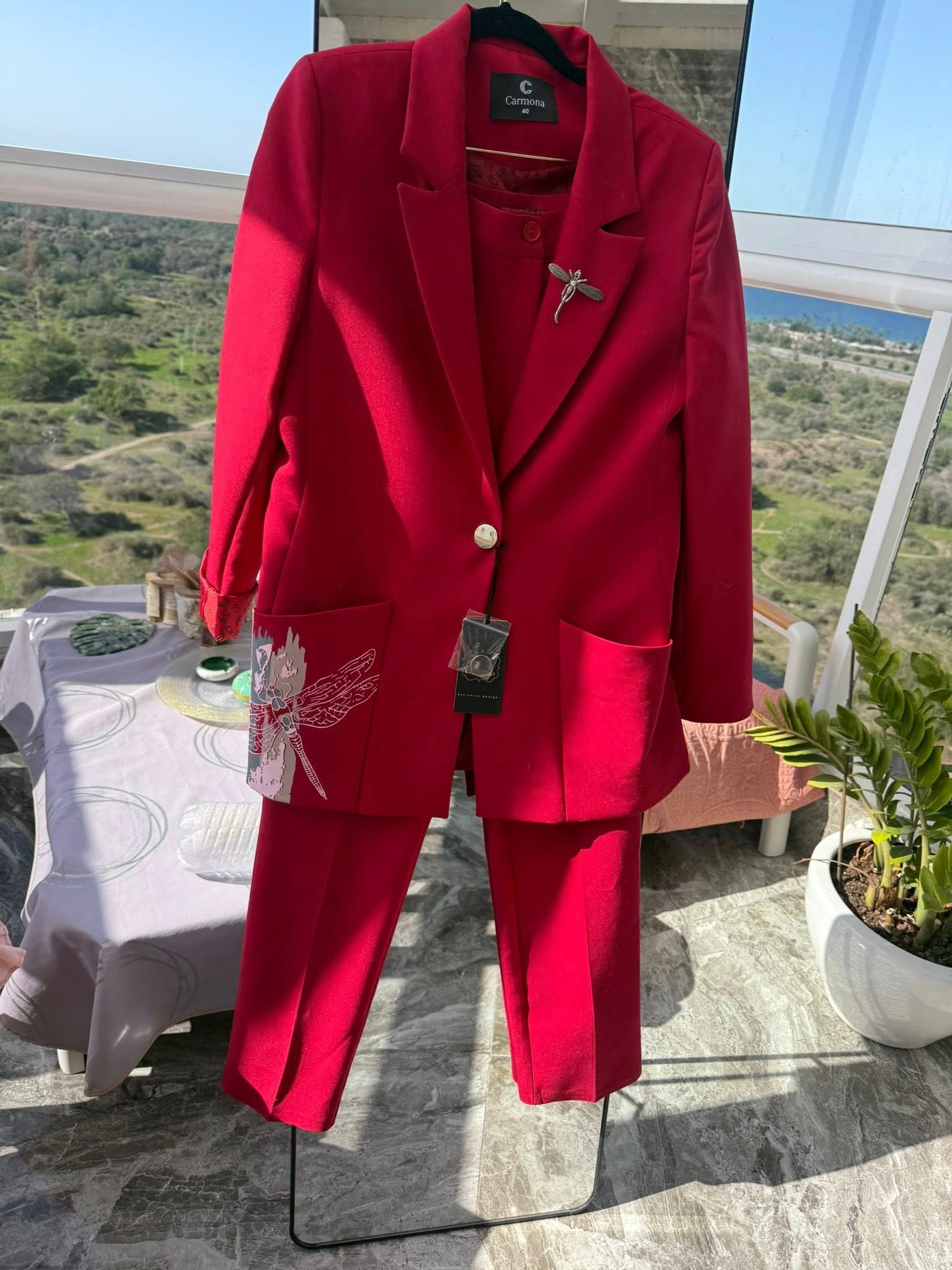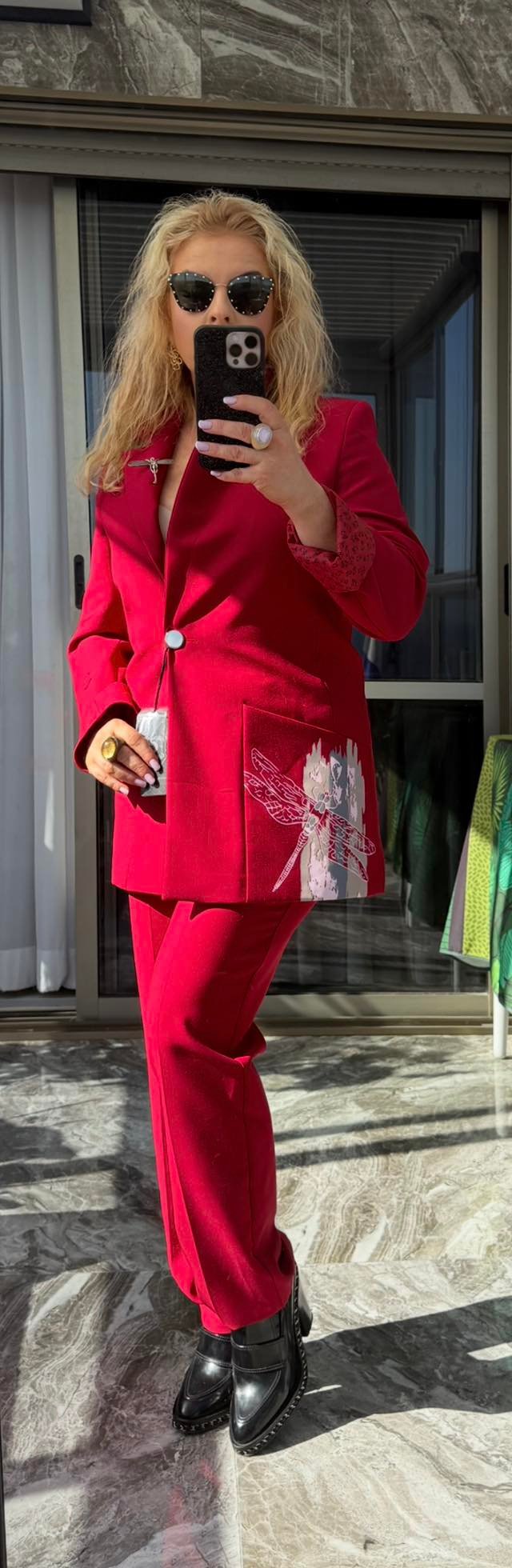 Главный акцент — **фирменная брошь-стрекоза и вышивка на кармане**, добавляющие уникальности и утончённого шарма. Материал красиво держит форму, делает комплект комфортным и универсальным: работа, встречи, вечер, свидание — костюм идеально впишется в любой стильный сценарий.
