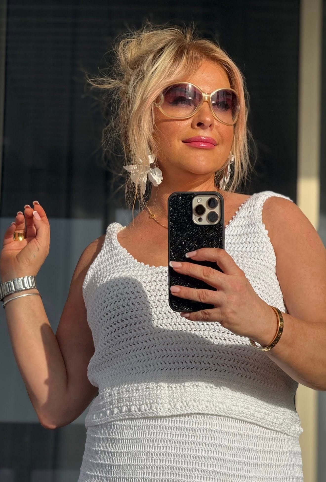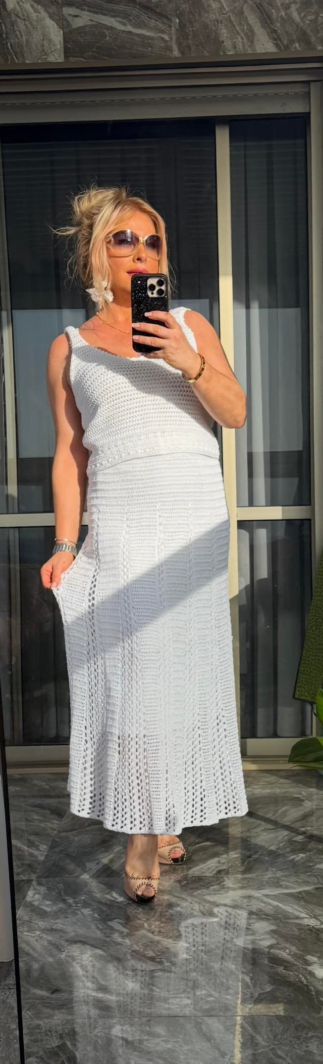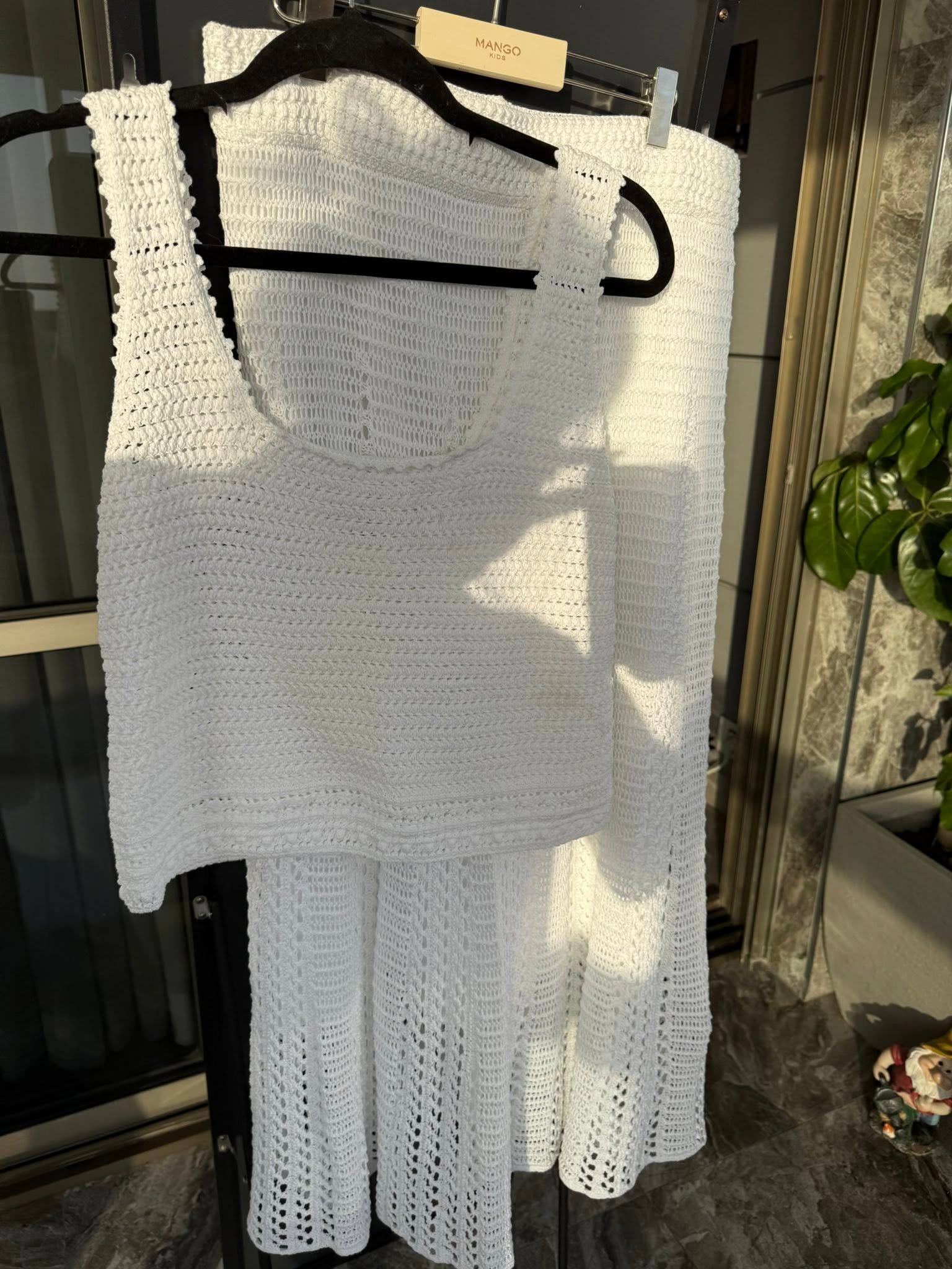 RU: Летний вязаный комплект Vince из органического хлопка: свободный топ и миди-юбка с красивой ажурной вязкой. Лёгкий, дышащий, универсальный — носите вместе или по отдельности.