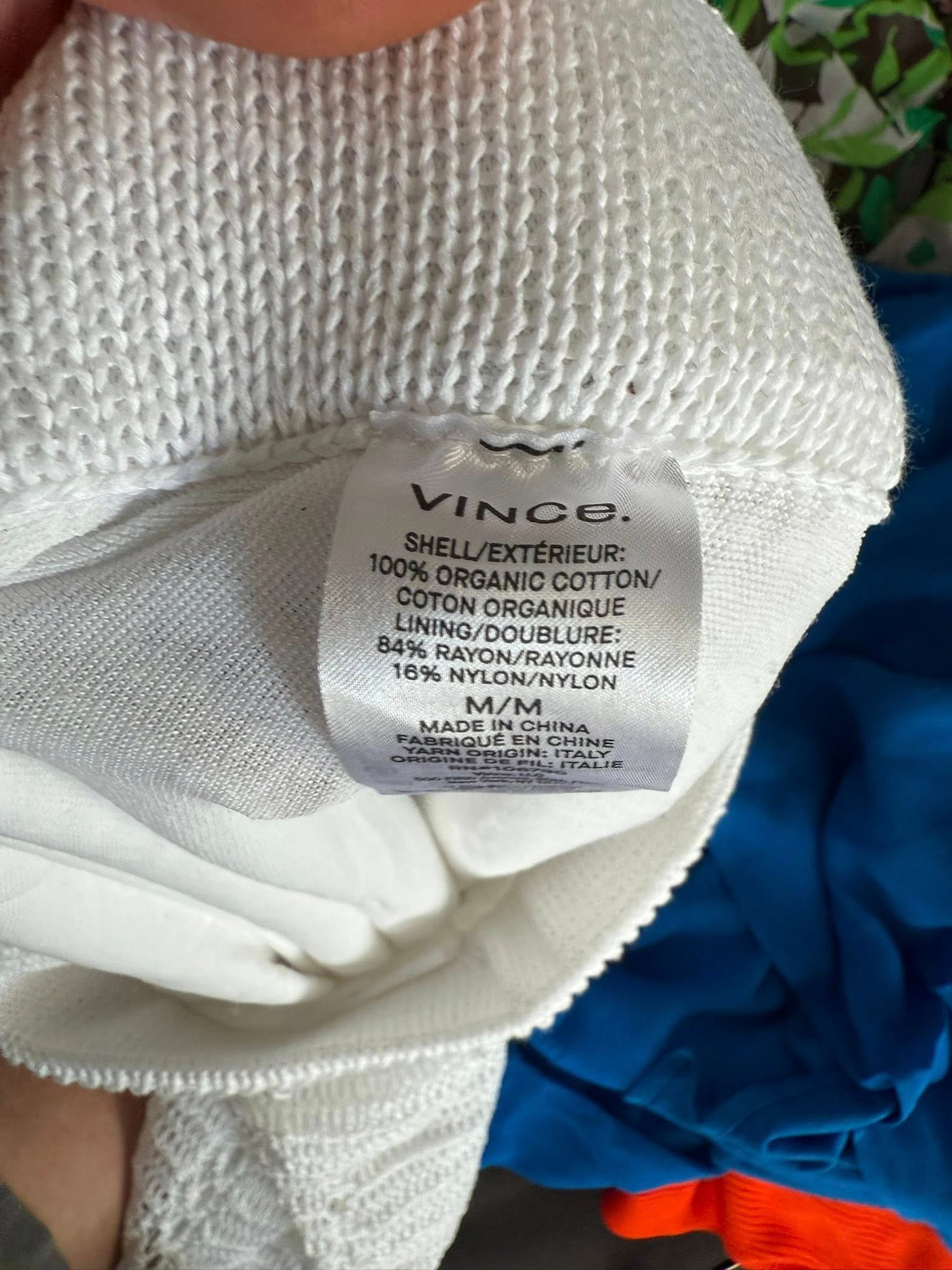 HE: סט קיץ סרוג של Vince מכותנה אורגנית: טופ רפוי וחצאית מידי בסריגה תחרתית. קליל ונושם – מתאים גם יחד וגם בנפרד.