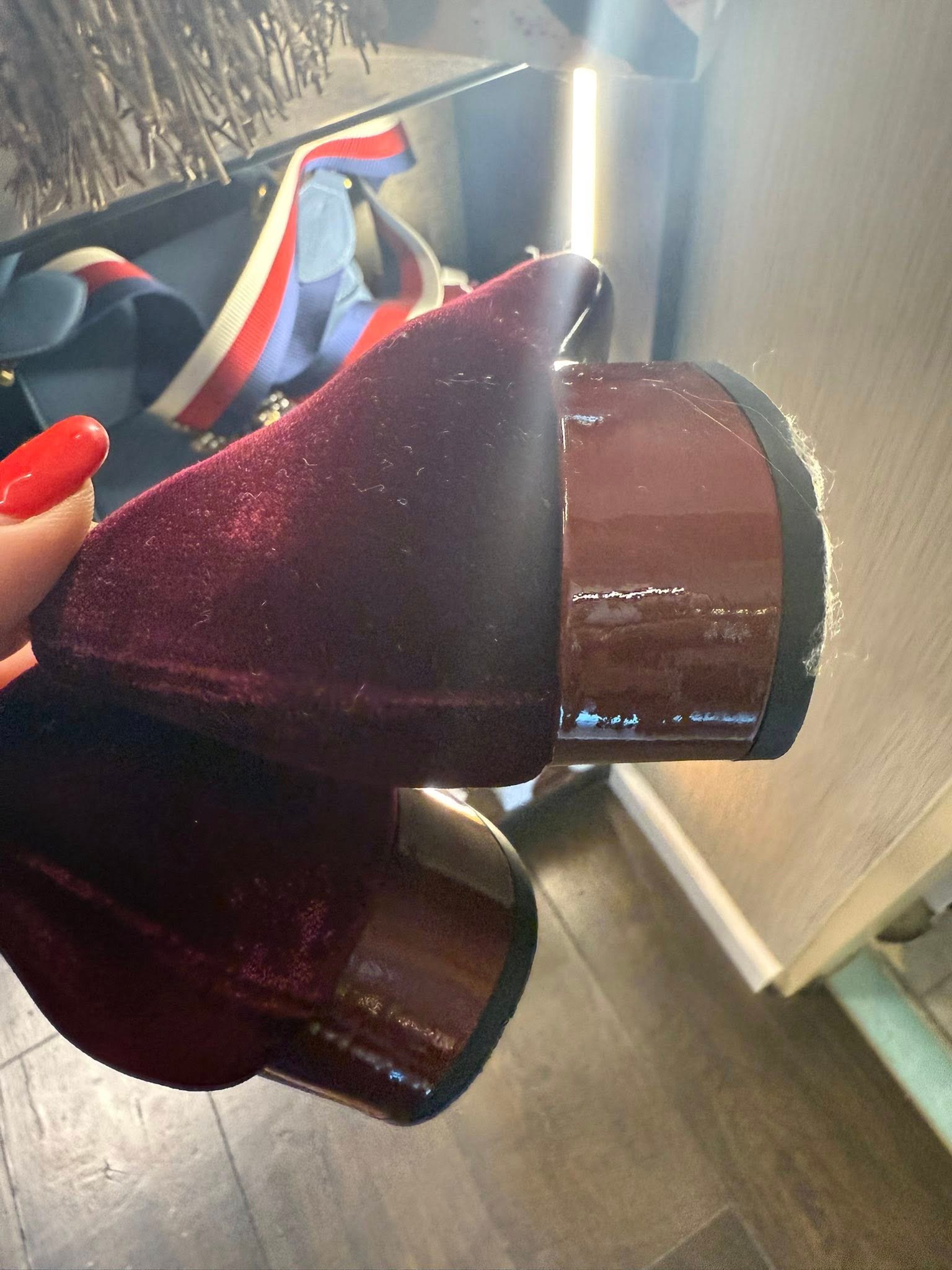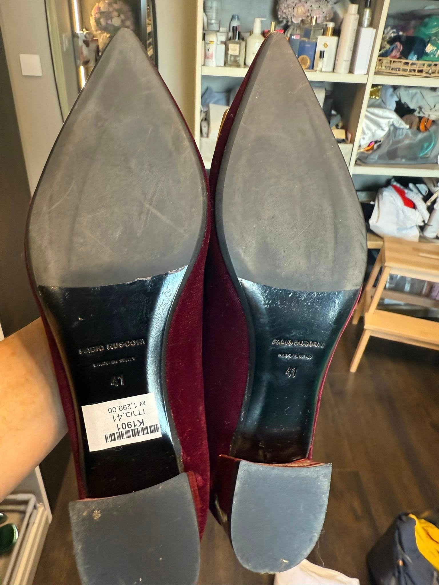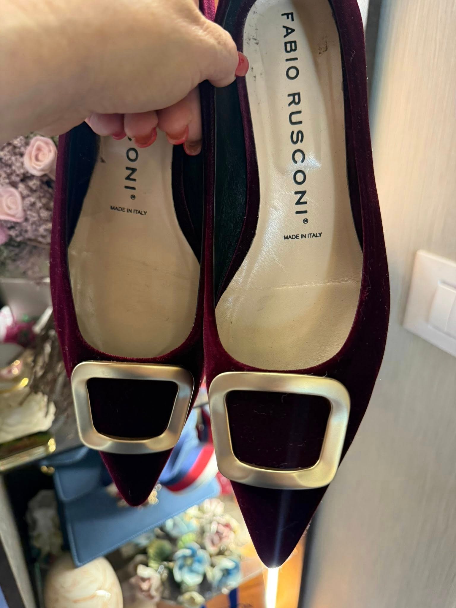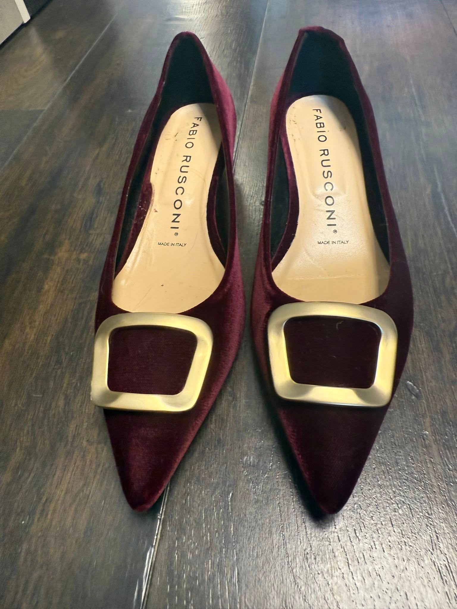 נעלי קטיפה של המותג האיטלקי Fabio Rusconi. צבע בורדו עמוק עם אבזם דקורטיבי. מתאימות ללוק ערב אלגנטי וגם לשימוש יומיומי.