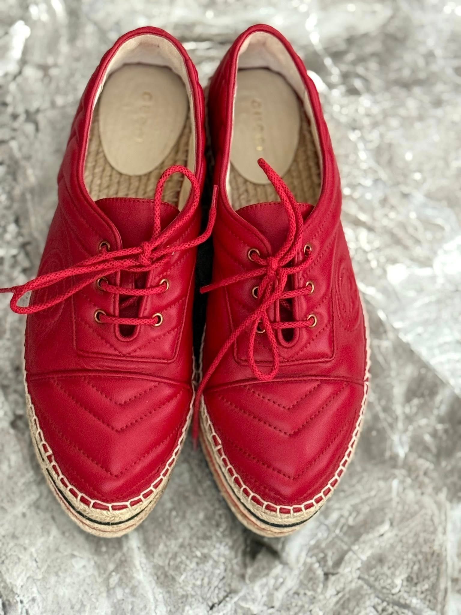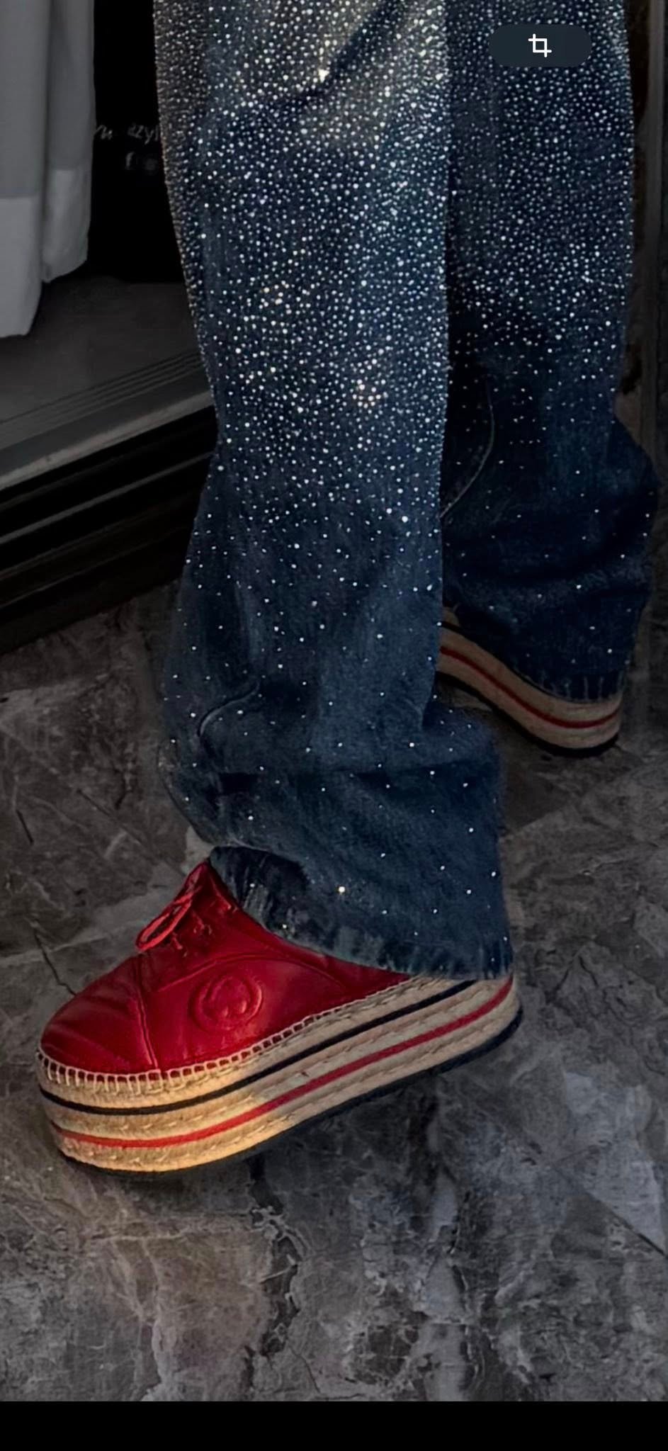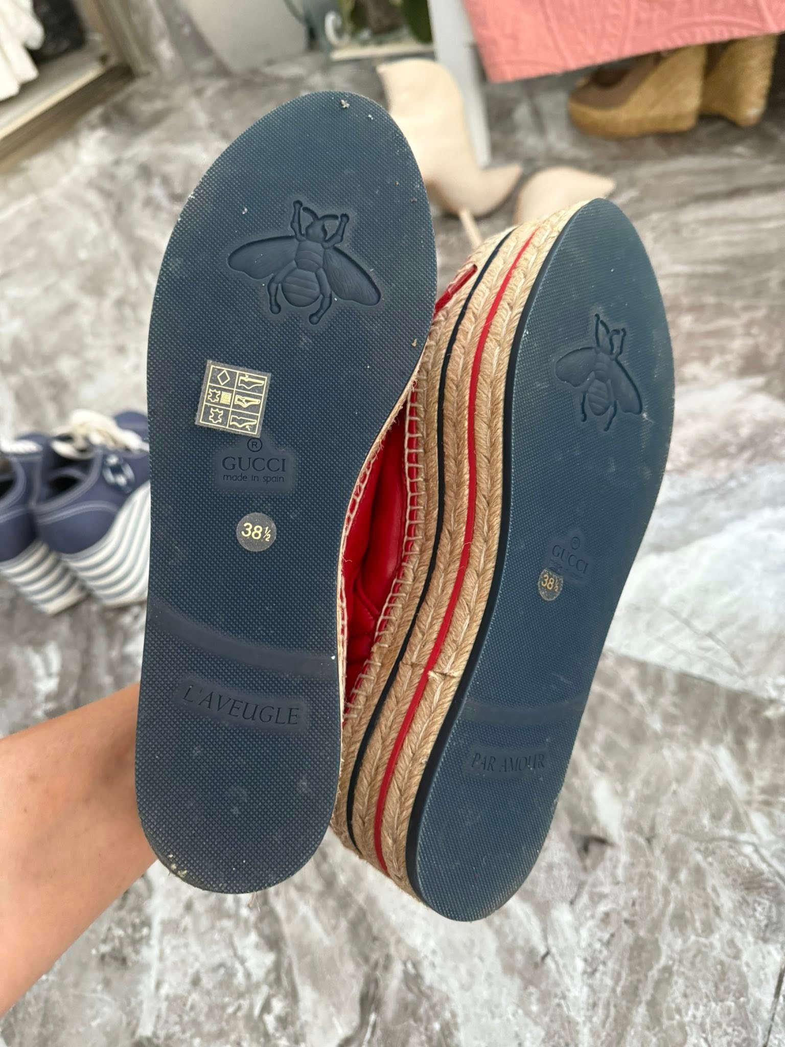 RU: Яркий акцент уровня “дорого и смело” ❤️ Оригинальные Gucci — кожаные эспадрильи на высокой джутовой платформе в насыщенном красном цвете. Смотрятся супер эффектно, при этом удобные для ходьбы: платформа добавляет рост и вытягивает силуэт, а мягкая кожа комфортно садится по ноге. Идеальны, когда хочется сделать образ заметным без лишних усилий — просто джинсы + базовый топ, и уже “вау”.
