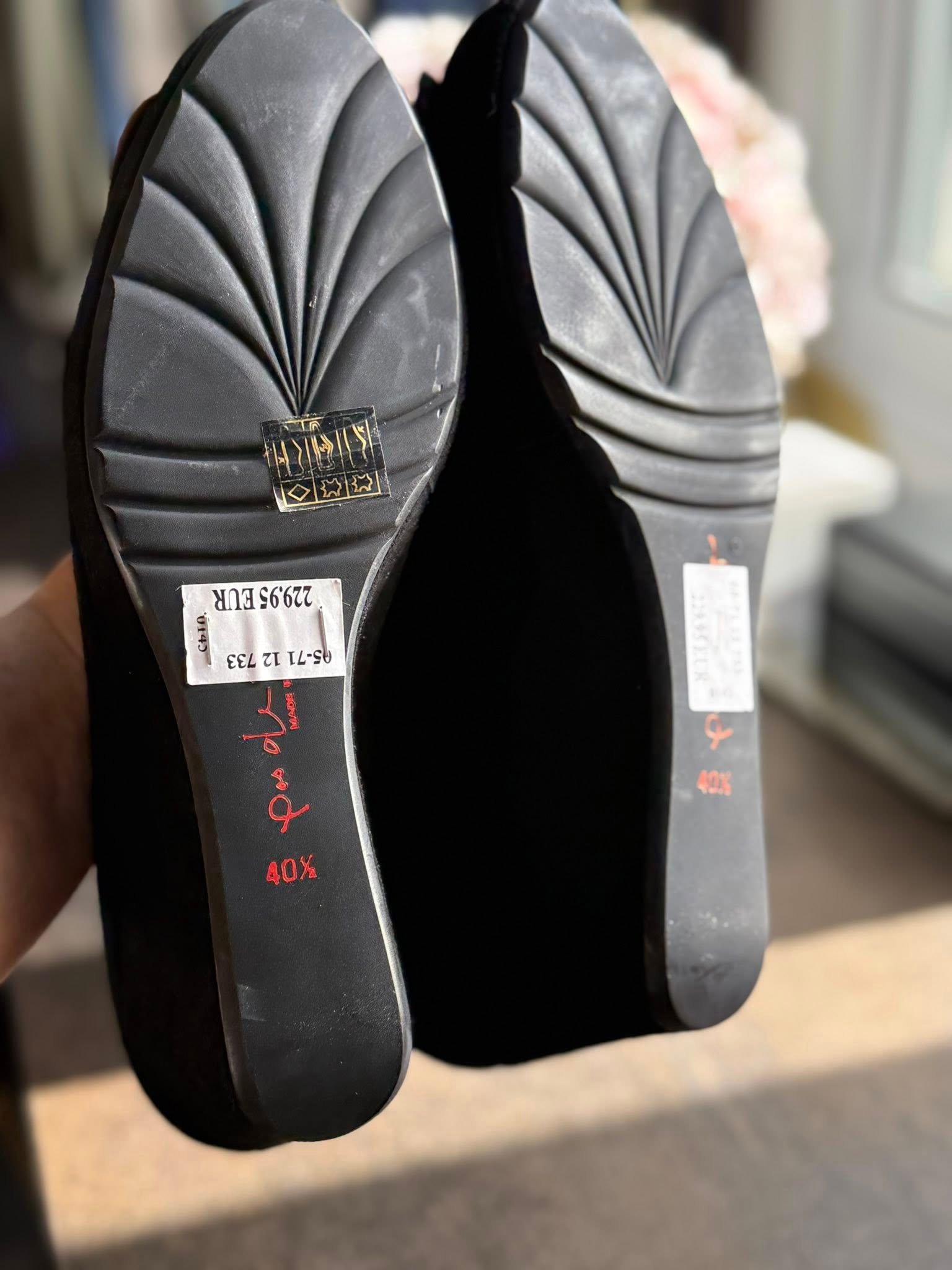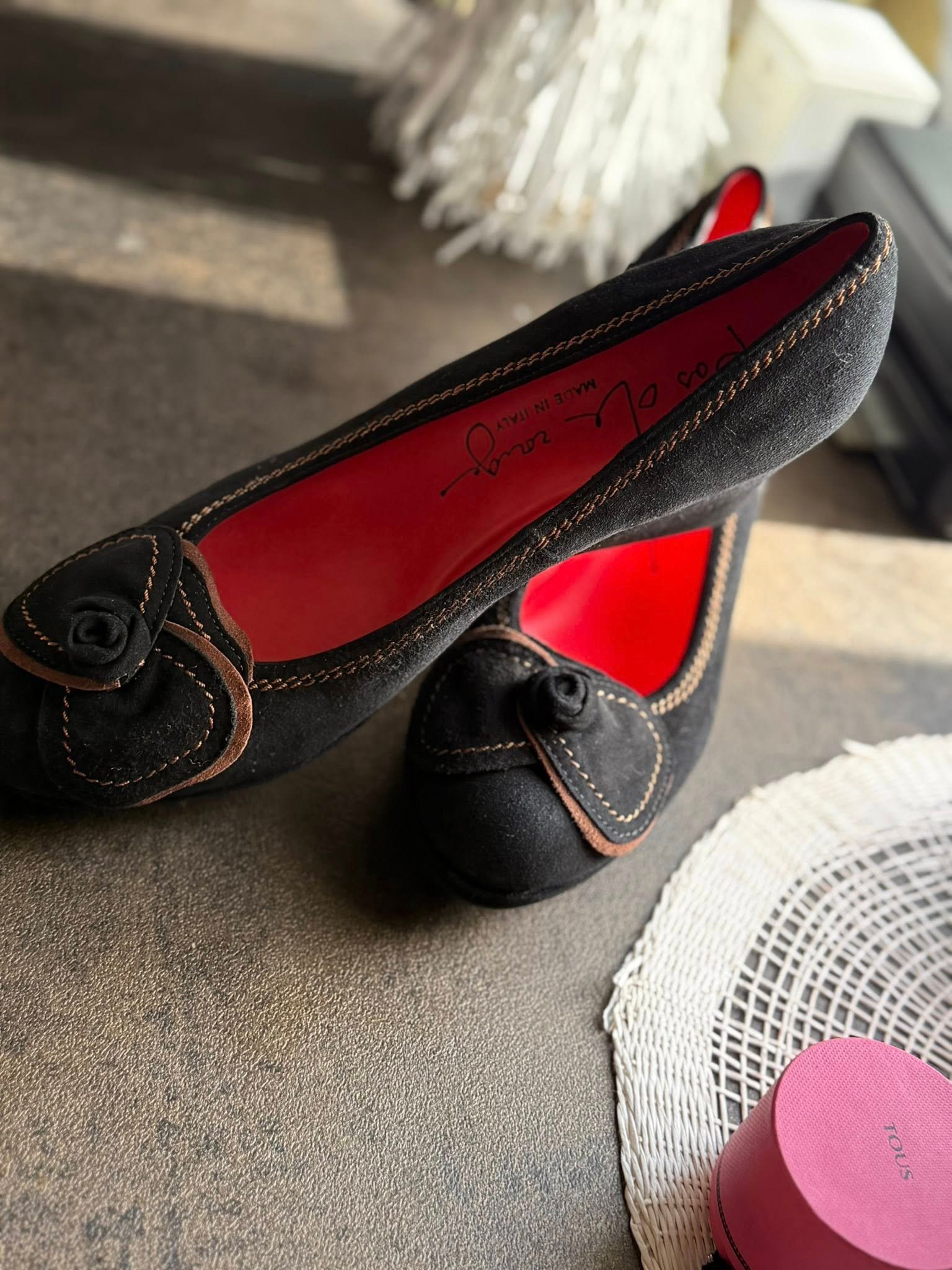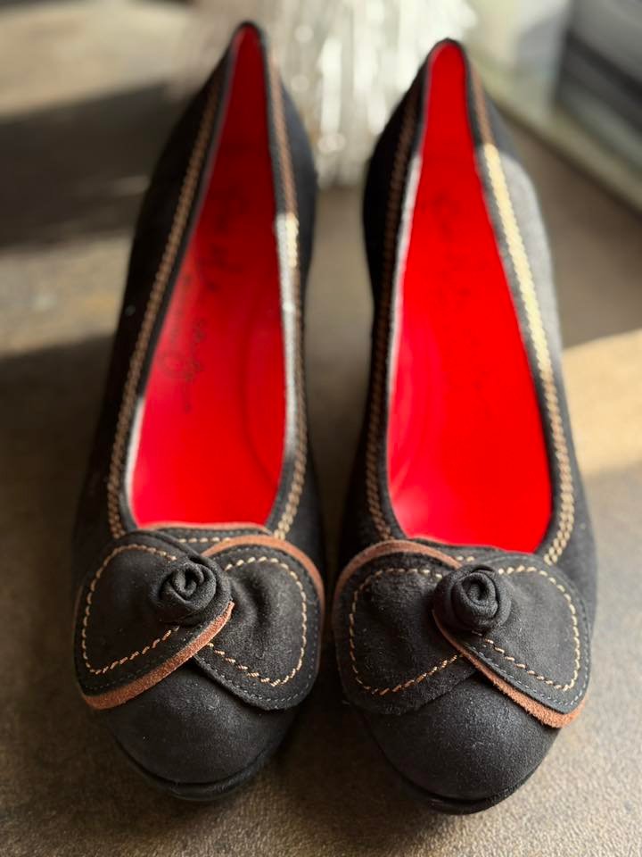 נעלי עקב של Rossorossi עשויות מעור זמש רך בגוון שחור קלאסי. עיצוב ייחודי עם תפרים עדינים ופרח קטן בחזית. פנים הנעל בגוון אדום עמוק — שילוב מושלם של תשוקה ואלגנטיות. נוחות במיוחד ומעוצבות באיכות גבוהה מתוצרת איטליה 🇮🇹