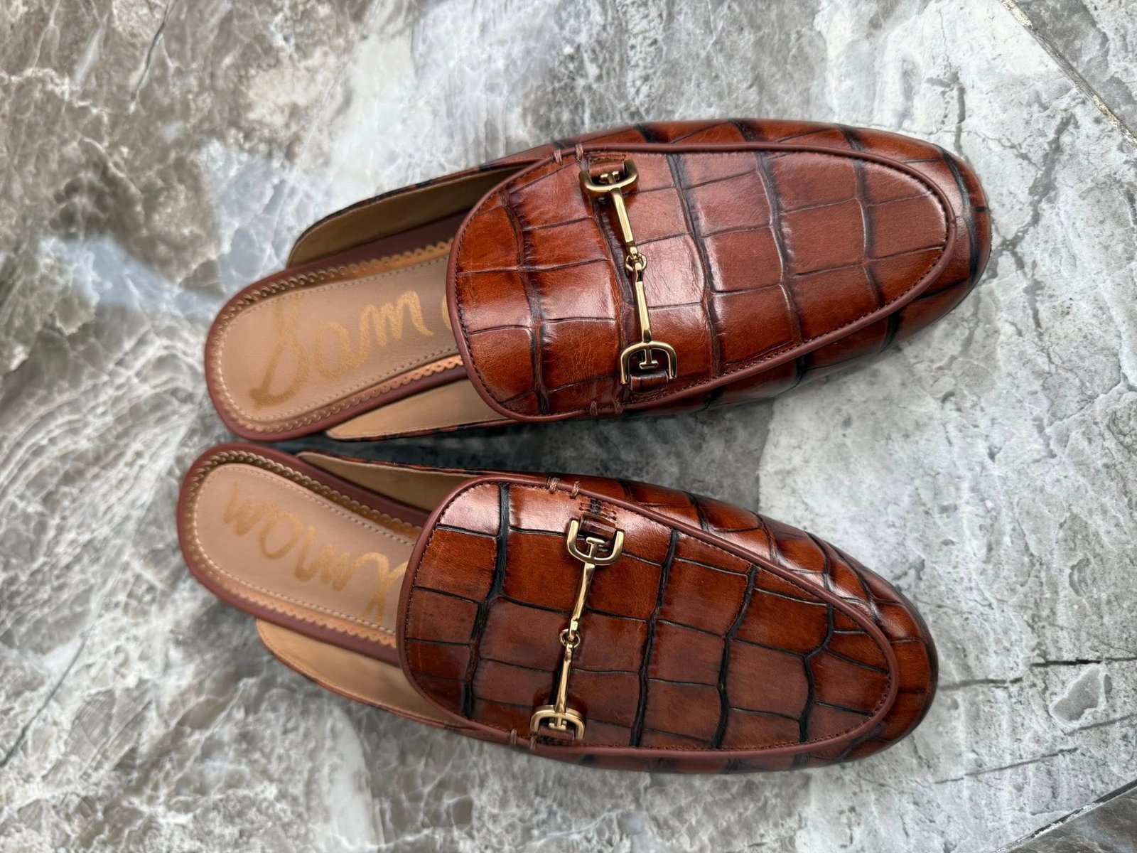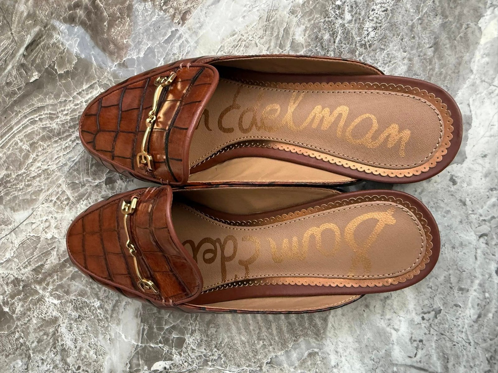 HE: כפכפי מיולס של Sam Edelman – בסיס יוקרתי מושלם ✨ גוון קוניאק חם, הטבעת קרוקו ואבזם זהב למראה אלגנטי ומוקפד. משתלבים נהדר עם ג’ינס, מכנסי פשתן, שמלות ולוקים משרדיים.