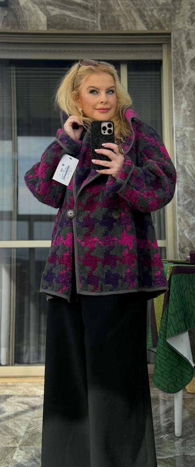 מעיל קצר של WELL צרפת, מבד צמר איכותי עם טקסטורה מעניינת ודוגמת האונדסטות גדולה בצבעים פוקסיה, אפור ושזיף. פריט ייחודי שמוסיף סטייל ליומיום ולערב.