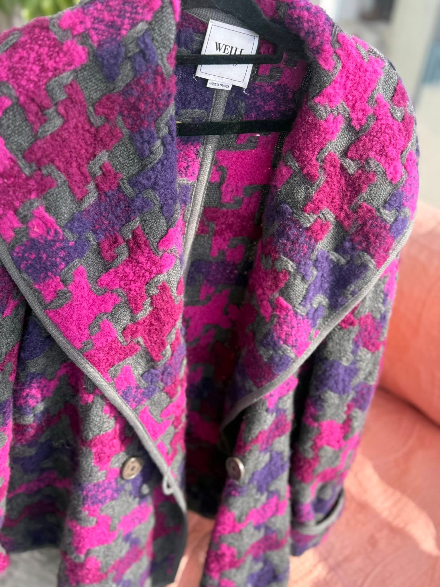 Мини-пальто от бренда WELL (Made in France) — это уникальная дизайнерская находка. Фактурная шерстяная ткань, эффектный крупный рисунок «houndstooth» в оттенках фуксии, графита и сливового — делает вещь по-настоящему редкой и выразительной.